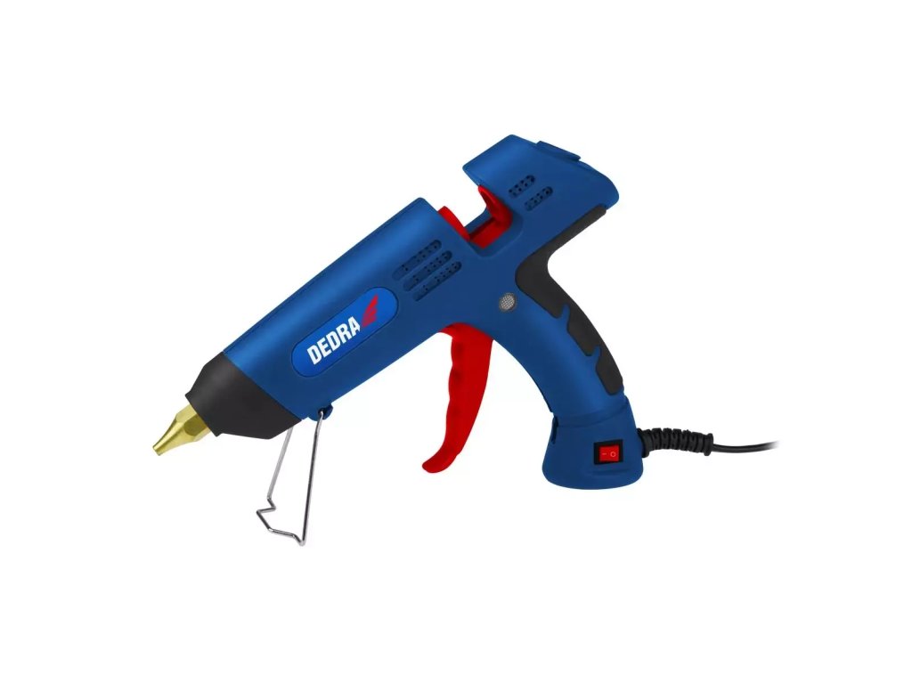 Lepiaca pištoľ DEDRA DED7556 má stabilný drôtený stojan na jednoduché umiestnenie pištole počas prevádzky akonštrukcia trysky zabraňuje úniku lepidla po uvoľnení spúšte.