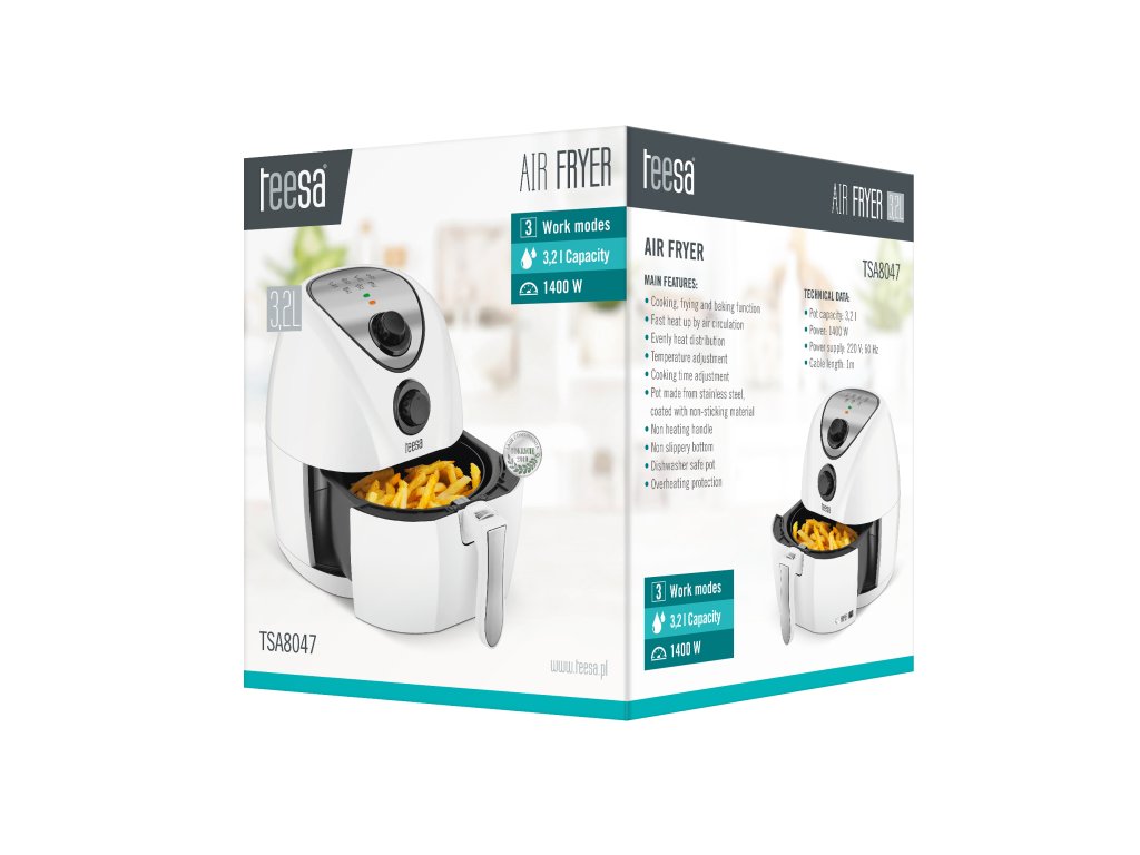 Fritéza Teesa Air Fryer bez tuku je ideálna pre osoby, ktoré sa potrebujú postarať o jedlo pre celú rodinu. Spotrebič je vybavený nerezovou misou s objemom 3,2 litra. Veľká kapacita vám umožní rýchlo pripraviť večeru aj pre niekoľko osôb.