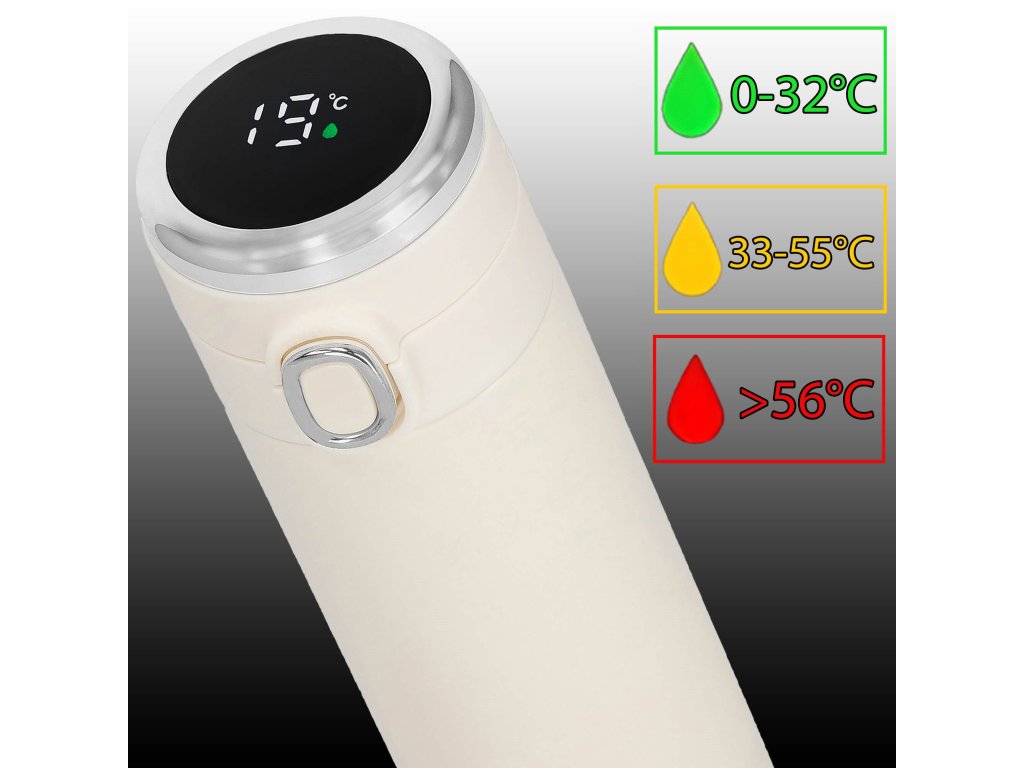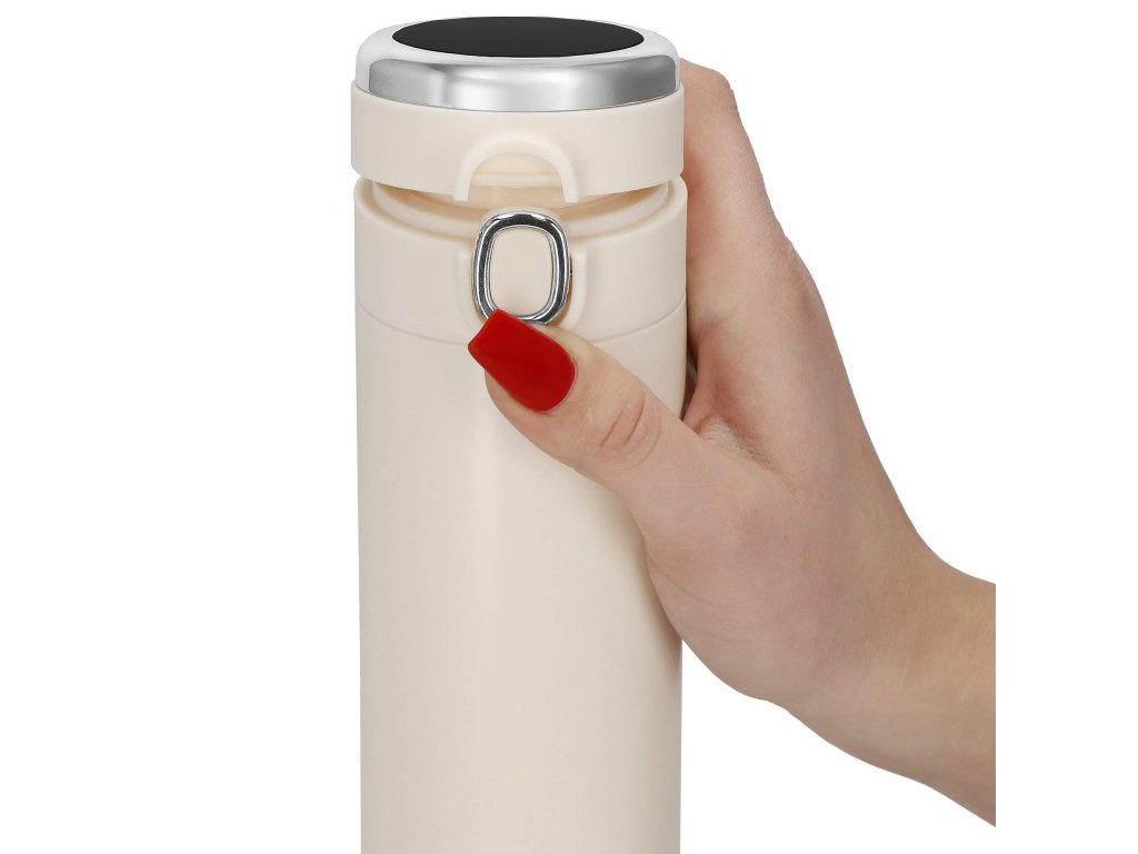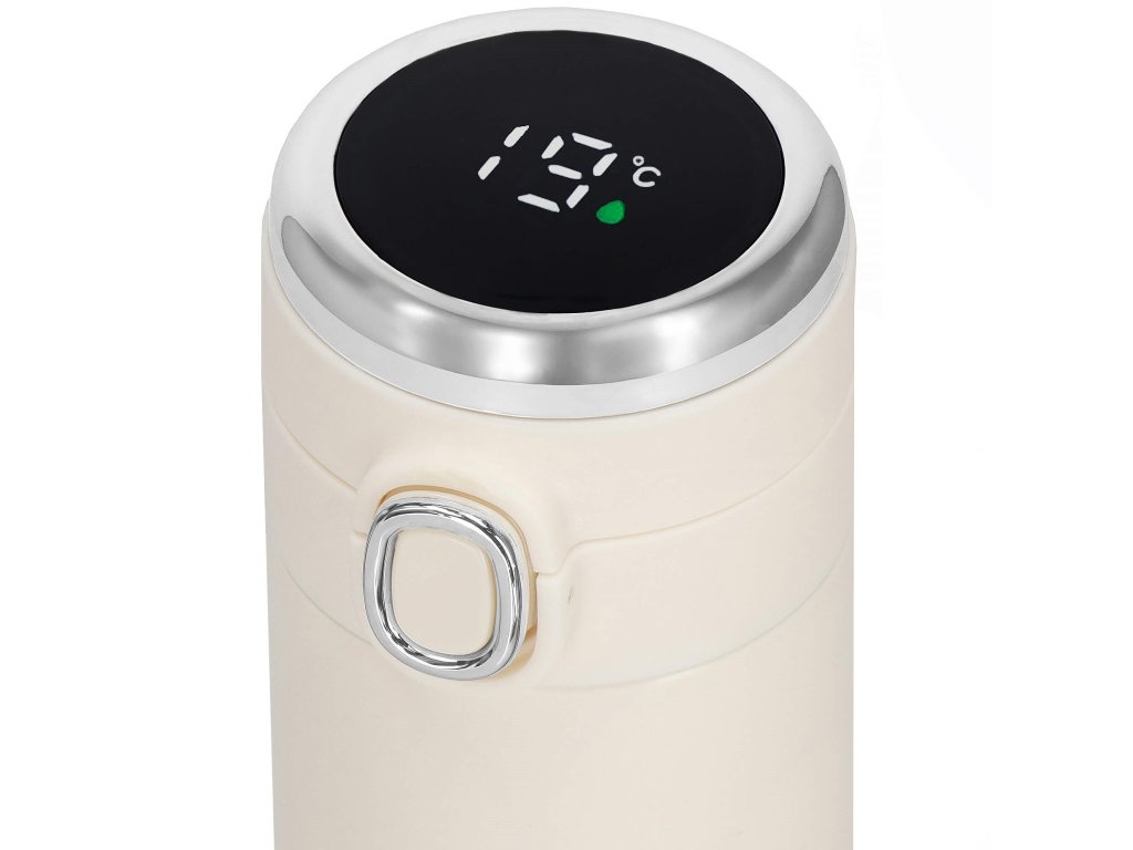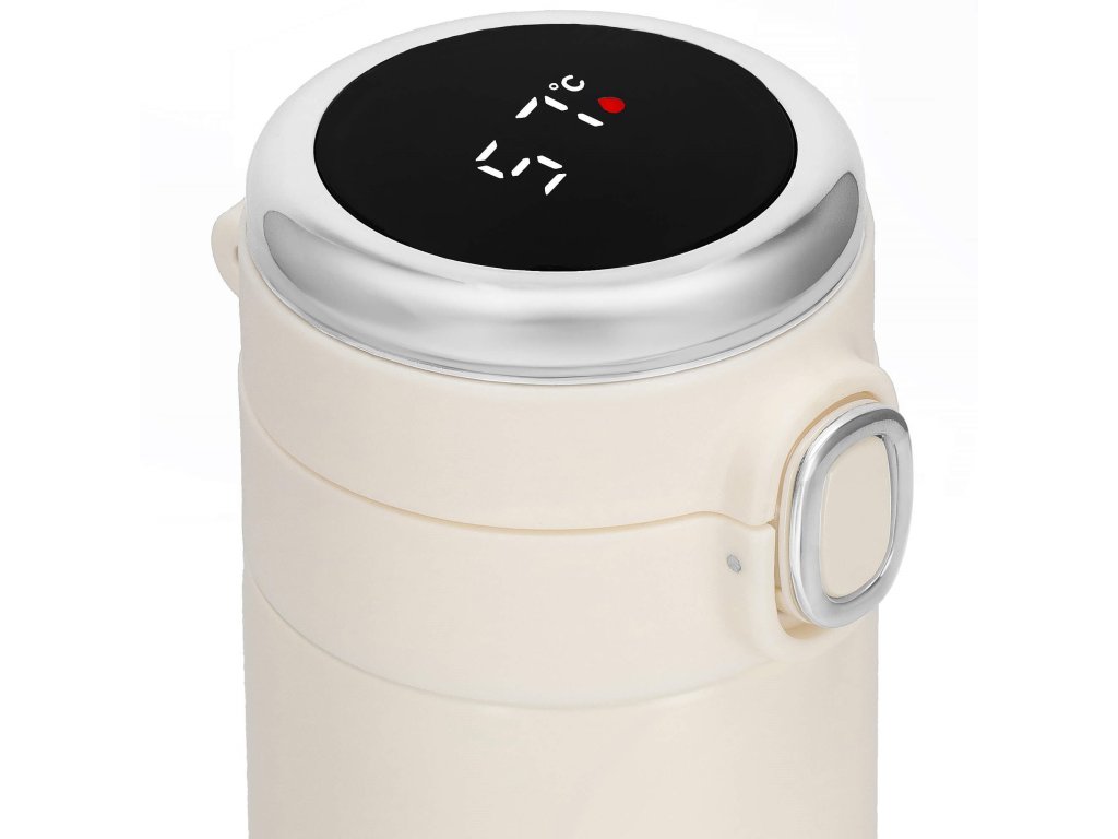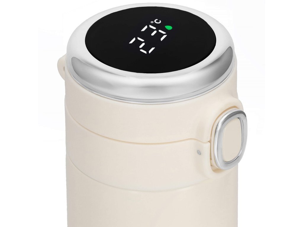 - Elektronický displej teploty na vrchu uzáveru, v stupňoch Celzia, farba kvapôčky na displeji indikuje stupeň tepla nápoja: zelená, oranžová, červená