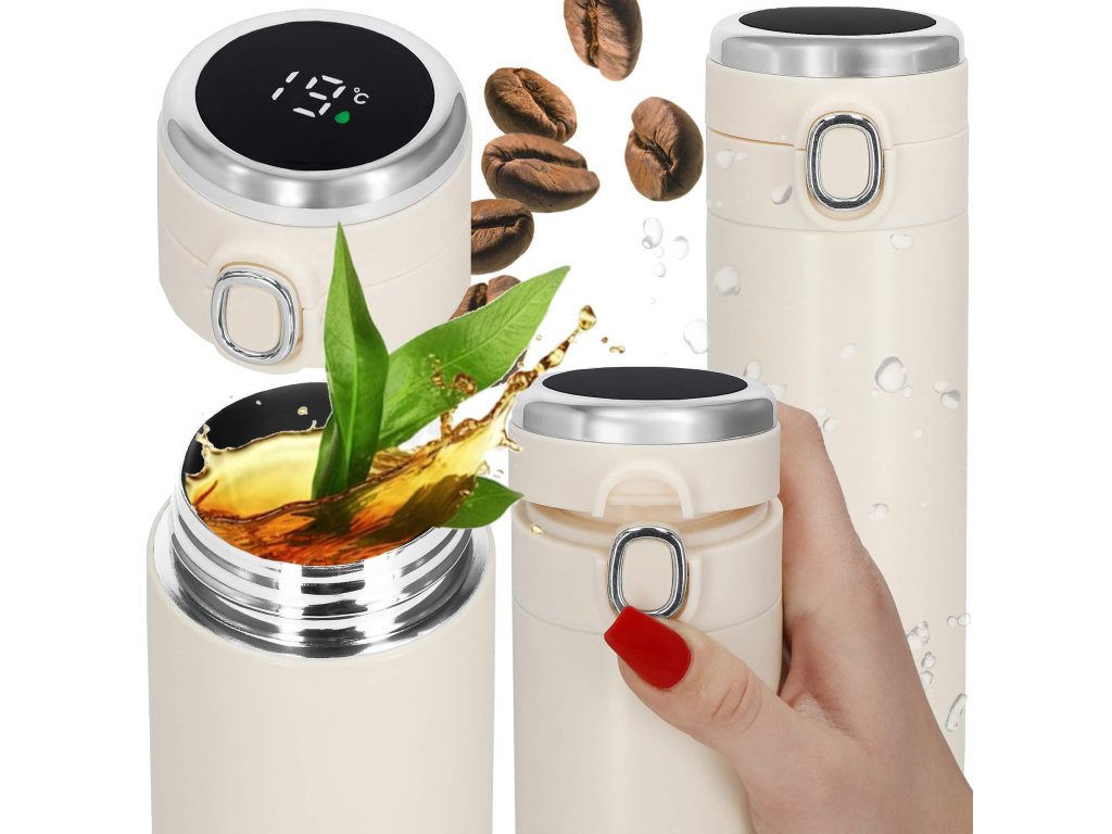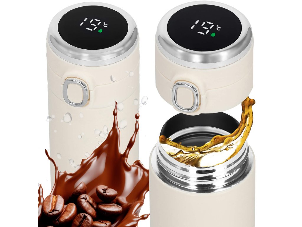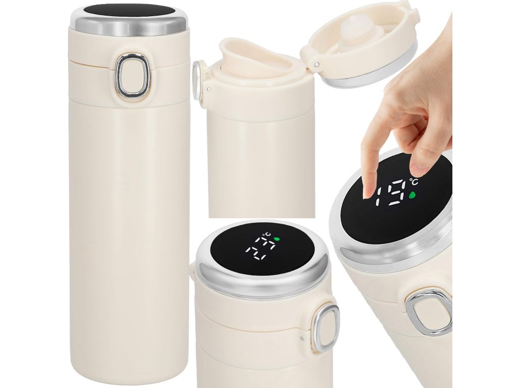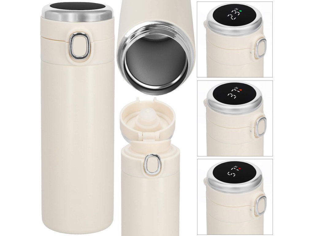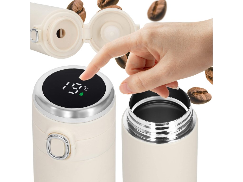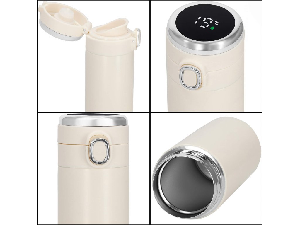 - Elektronický displej teploty na vrchu uzáveru, v stupňoch Celzia, farba kvapôčky na displeji indikuje stupeň tepla nápoja: zelená, oranžová, červená