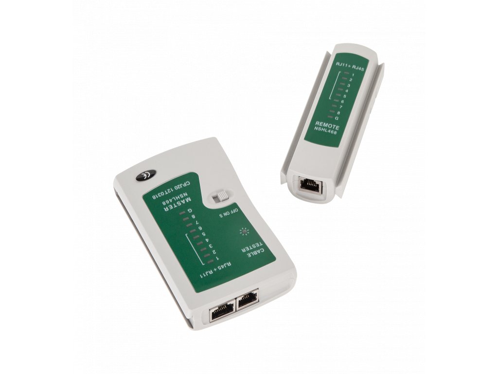 Tester určený na testovanie sieťovej kabeláže typu RJ45: UTP, FTP, STP a telefónnych káblov typu: RJ11 a RJ12.