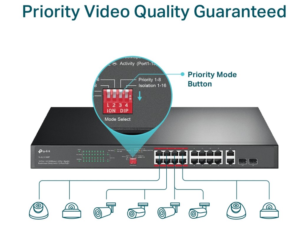 Nezaradený switch PoE TL-SL1218MP so 16 portami podporujúcimi štandard PoE+ je ideálny spôsob, ako rozšíriť káblovú sieť, pričom súčasne prenáša dáta a napájanie cez ten istý Ethernet kábel, čo vedie k nižším nákladom na sieťovú infraštruktúru. Celkový výkonový rozpočet switcha je 192 W, teda až 30 W na každý port - vďaka tomu zariadenie môže napájať viac zariadení s vysokým odberom, ako sú prístupové body, IP kamery, IP telefóny atď. Inovatívny režim predĺženia dosahu napájania PoE a prenosu dát siaha do 250 m. Aktivácia režimu prioritizácie zabezpečuje vybraným portom vysokú prioritu, čo zlepší fungovanie v systémoch vyžadujúcich nepretržitú prevádzku - napríklad monitorovacie systémy. Inštalácia Plug&play zabezpečuje okamžitú činnosť switcha bez nutnosti konfigurácie a funkcia auto MDI/MDIX eliminuje potrebu používania krížených káblov.