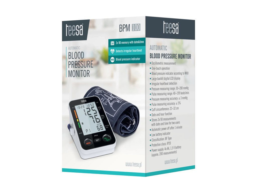 Tlakomer Teesa BPM 100 na rameno je nevyhnutnou súčasťou vašej domácnosti. Zariadenie sa ľahko používa a na rýchle a nezávislé monitorovanie krvného tlaku využíva metódu merania tlaku pomocou oscilometrickej manžety. Dôležité je, že zariadenie vás vďaka svojej funkčnosti informuje o akýchkoľvek abnormalitách súvisiacich so srdcovou arytmiou.