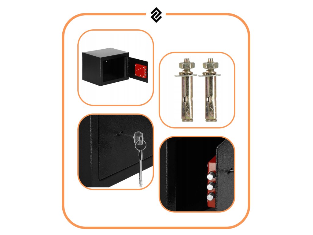 otvory a hmoždinky (2) na montáž do steny alebo podlahy - 2 v zadnej časti trezoru a 2 v spodnej časti