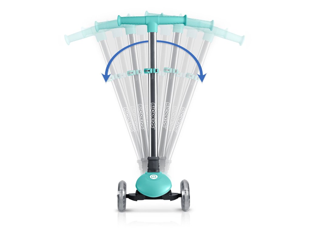 Riadenie sa vykonáva výlučne pomocou vyvažovania tela, bez otáčania riadidlami. Stačí sa ľahko nakloniť do požadovanej strany a hotovo! Dieťa rýchlo zvládne túto techniku jazdy a zároveň trénuje svoj zmysel pre rovnováhu. Kolobežka, pri zatáčaní, stabilne udržuje vertikálnu pozíciu vďaka trom kolesám.