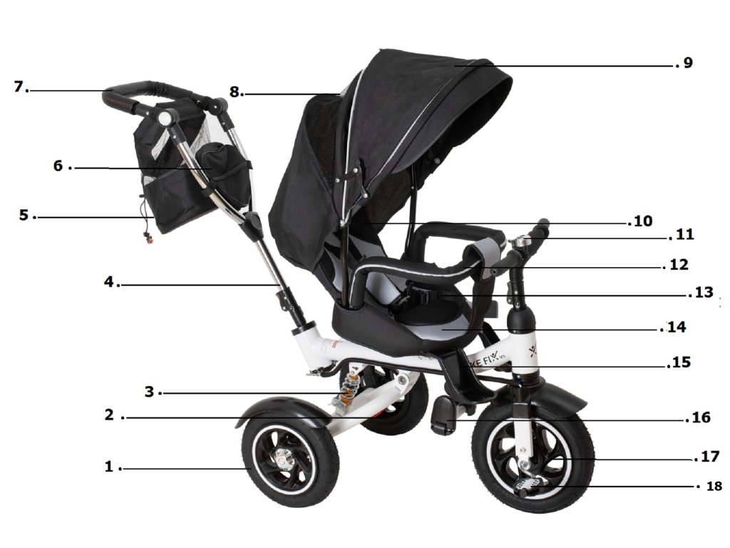 Madlo, poťah sedadla s popruhmi aj vodidlo pre rodiča sa dajú odstrániť, čím sa bicykel prispôsobí potrebám rastúceho dieťaťa.