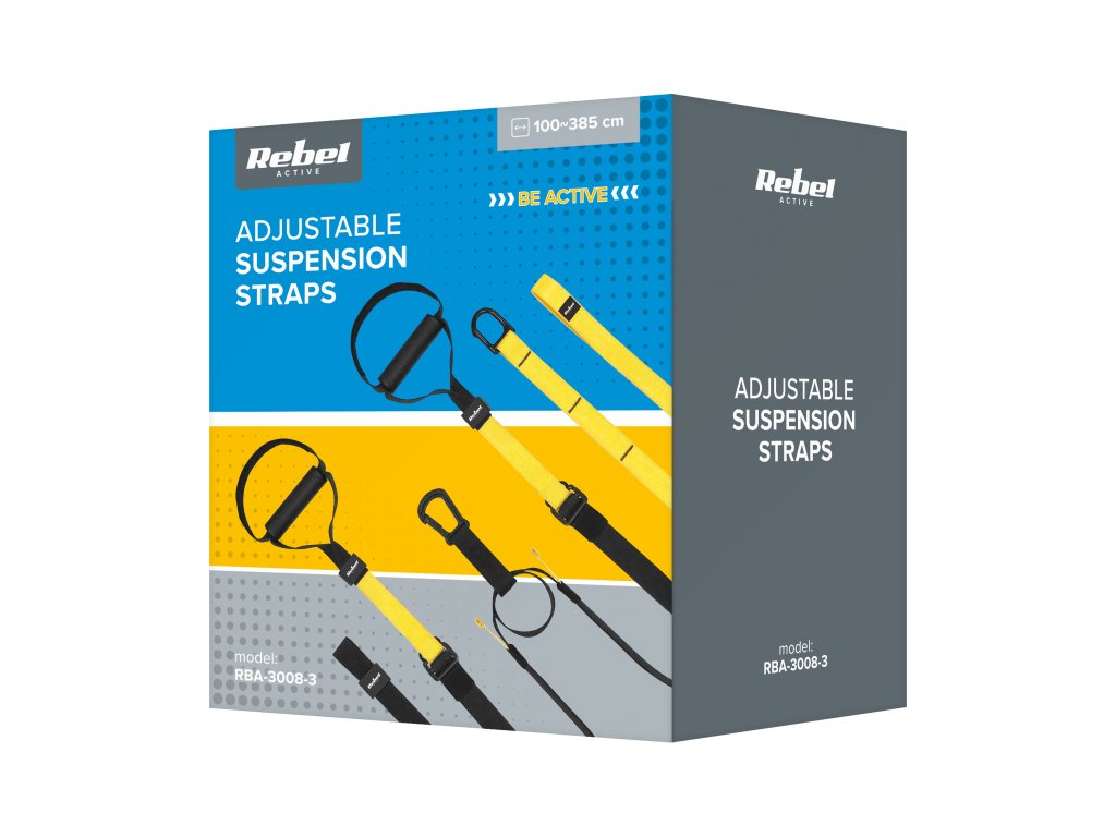 Sada obsahuje: 1x páska, 1x predlžovacia páska s karabínou (90 cm), 1x pomocná páska (95 cm), 1x kľučka na dvere (35 cm), taška na uloženie