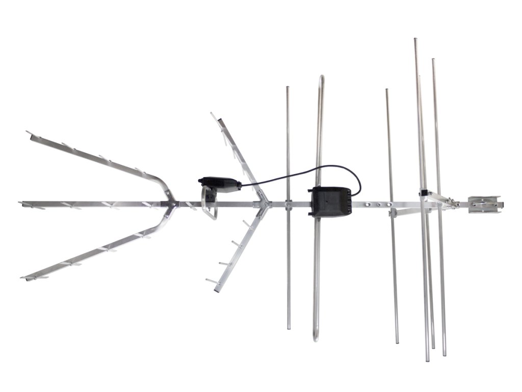 VKV anténa - zadná časť - kanály 6-12 v krabičke je anténny diplexer s káblom, ktorý je potrebné pripojiť k prvej časti antény, t. j. tria, keď do krabičky vložíme symetrizačný alebo anténny zosilňovač (zosilňovač ani symetrizačný nie je súčasťou dodávky), druhá časť má možnosť pracovať v horizontálnej alebo vertikálnej polarizácii. Kompatibilný s DVB-T2.