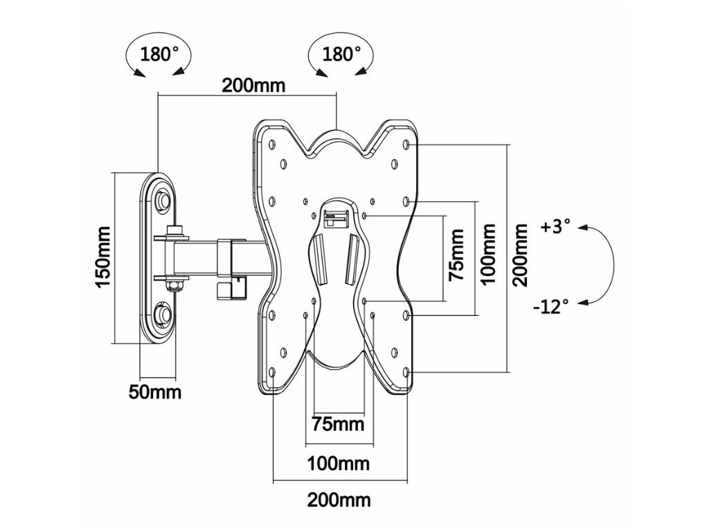Možnosť vzdialenia televízora od steny do 190mm poskytuje flexibilitu v nastavení a pevná konštrukcia zaručuje stabilitu a bezpečnosť montáže. TVM-432 je v súlade so štandardmi VESA 75x75, 100x100, 200x200 [mm].