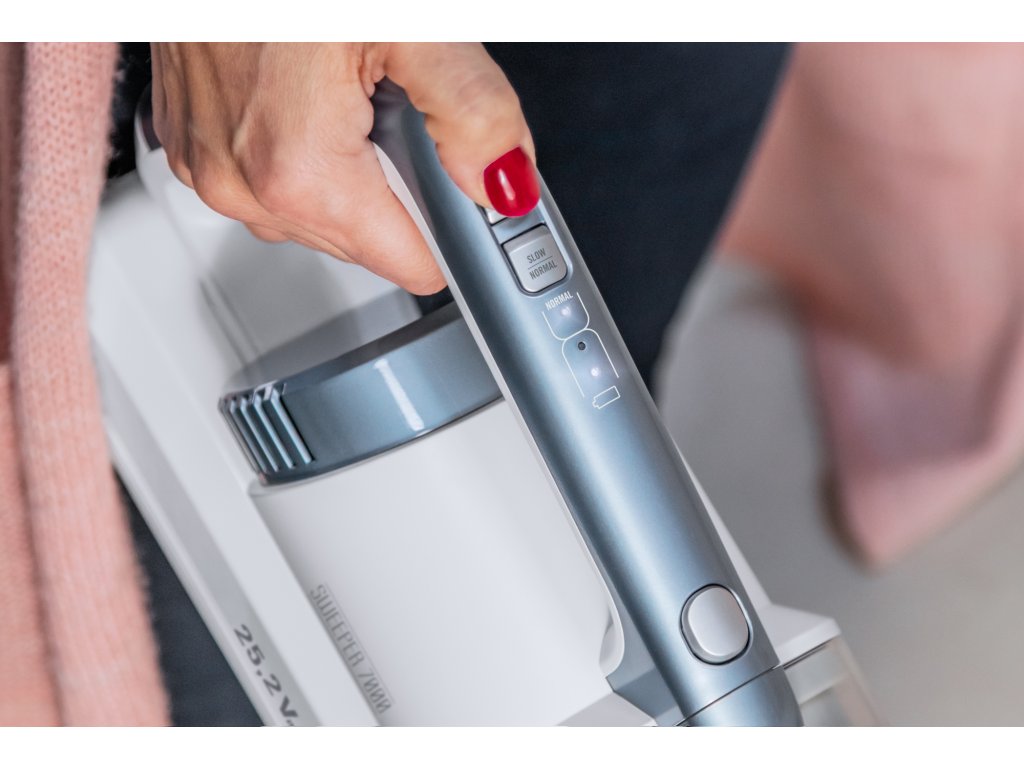 Rôzne nečistoty si vyžadujú rôzny výkon, preto má vertikálny vysávač Sweeper 7000 dvojstupňové nastavenie výkonu. Úroveň výkonu môžete pohodlne meniť pomocou tlačidla na rukoväti vysávača.