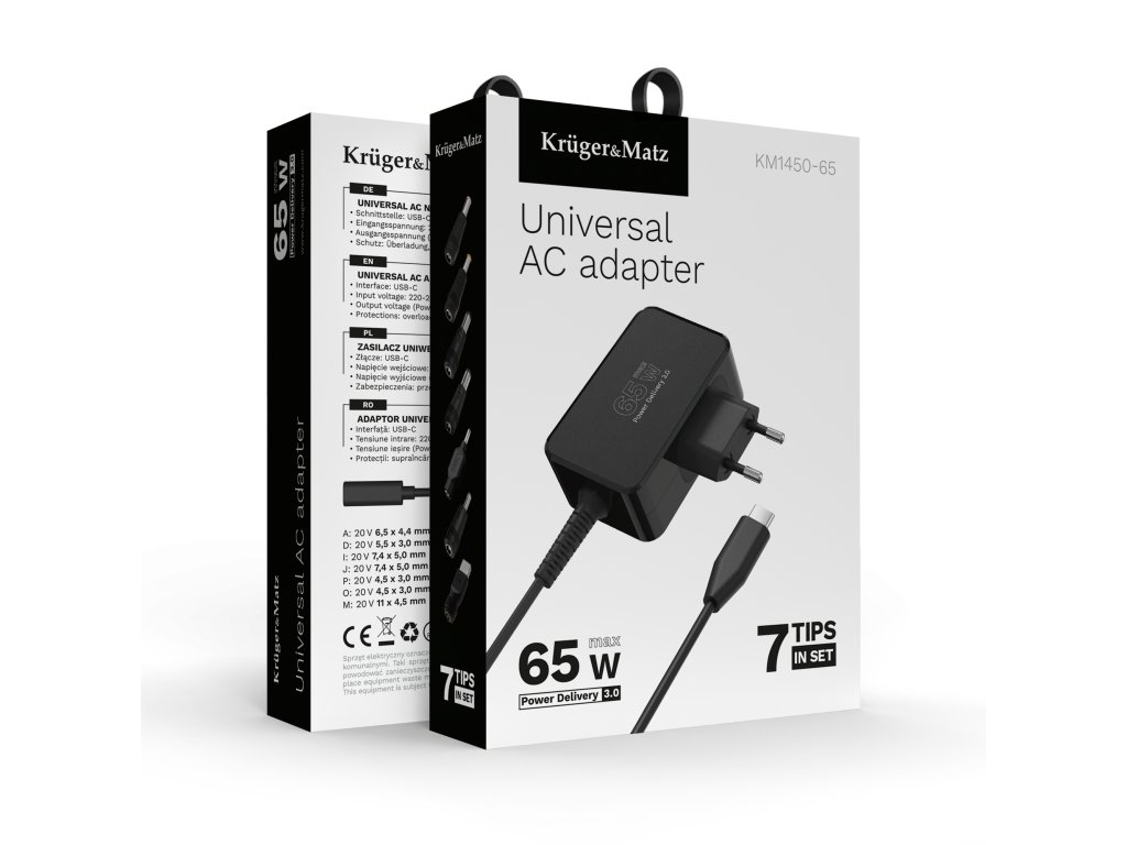 Univerzálny napájací adaptér Kruger&Matz 65W s funkciou Power Delivery 7 koncoviek