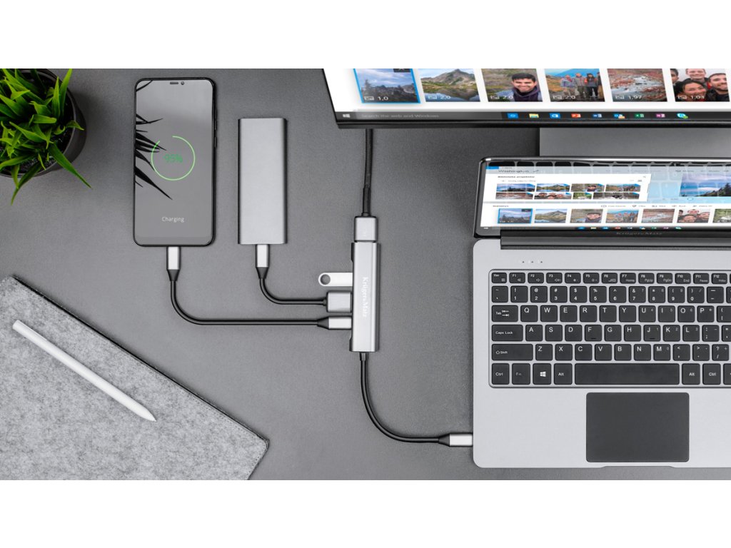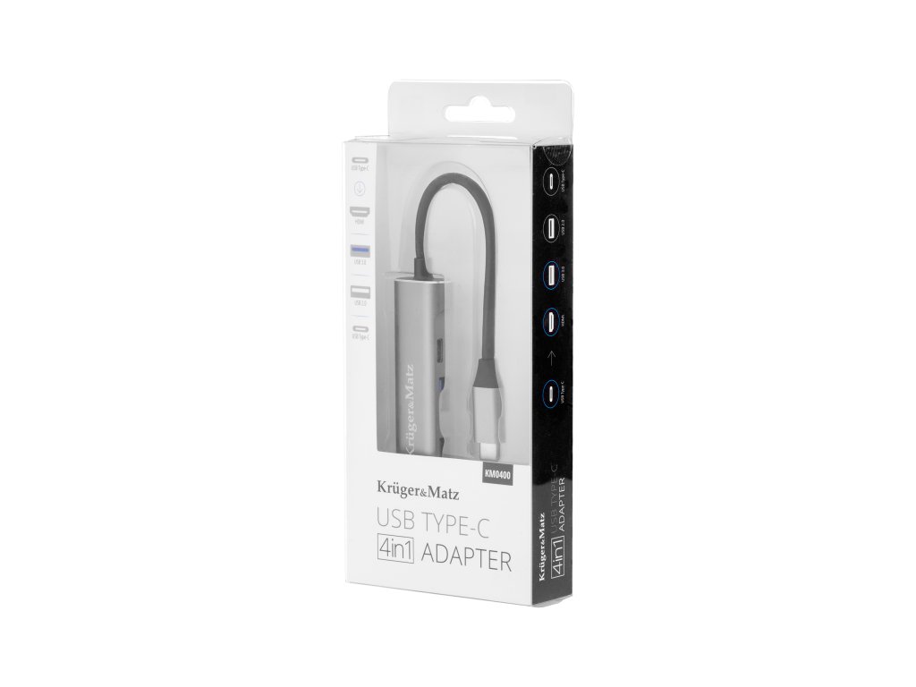 Adaptér má dva porty USB - 2.0 a 3.0 - pomocou ktorých môžete pripojiť klávesnicu alebo myš. Port USB 3.0 navyše zabezpečuje rýchly prenos dát až do 5 Gb/s. Tretím mimoriadne užitočným portom je výstup HDMI s podporou rozlíšenia 4K. Pripojte počítač k ďalšiemu monitoru alebo televízoru a vychutnajte si obraz v najvyššej kvalite. Veľkou výhodou adaptéra Kruger&Matz je port USB typu C, ktorý využíva technológiu Power Delivery. Umožňuje nielen rýchle nabíjanie telefónov, ale aj napájanie notebookov a monitorov.