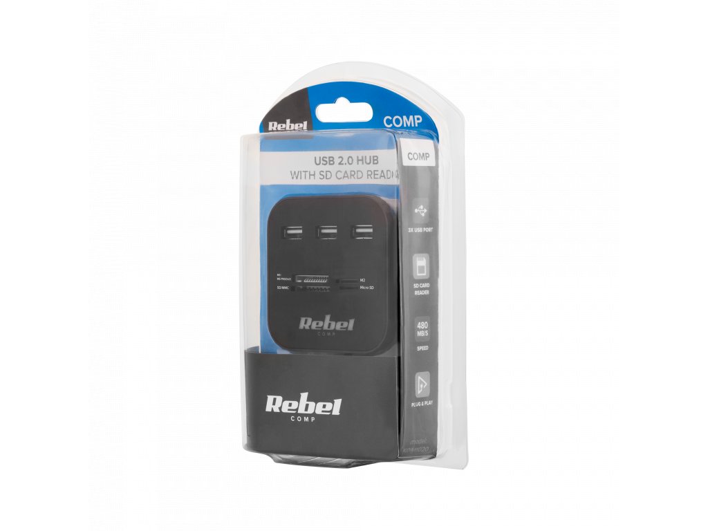 Klávesnica, myš, internetový modem, externá pamäťová karta... Niekedy počet portov USB, ktorými je vybavený váš počítač alebo notebook, nie je dostatočný. Vtedy prichádza na pomoc rozbočovač USB Rebel Comp s 2 ďalšími portami. Má rozhranie 2.0, ktoré umožňuje prenos dát rýchlosťou až 480 Mb/s, a hoci vyzerá nenápadne, môže výrazne rozšíriť funkčnosť zariadenia, na ktorom pracujete. Dôležité je, že toto príslušenstvo nie je len rozdeľovač USB. Môže slúžiť aj ako externá čítačka pamäťových kariet USB, ktorá umožňuje rýchly prístup k údajom uloženým na väčšine typov kariet.
