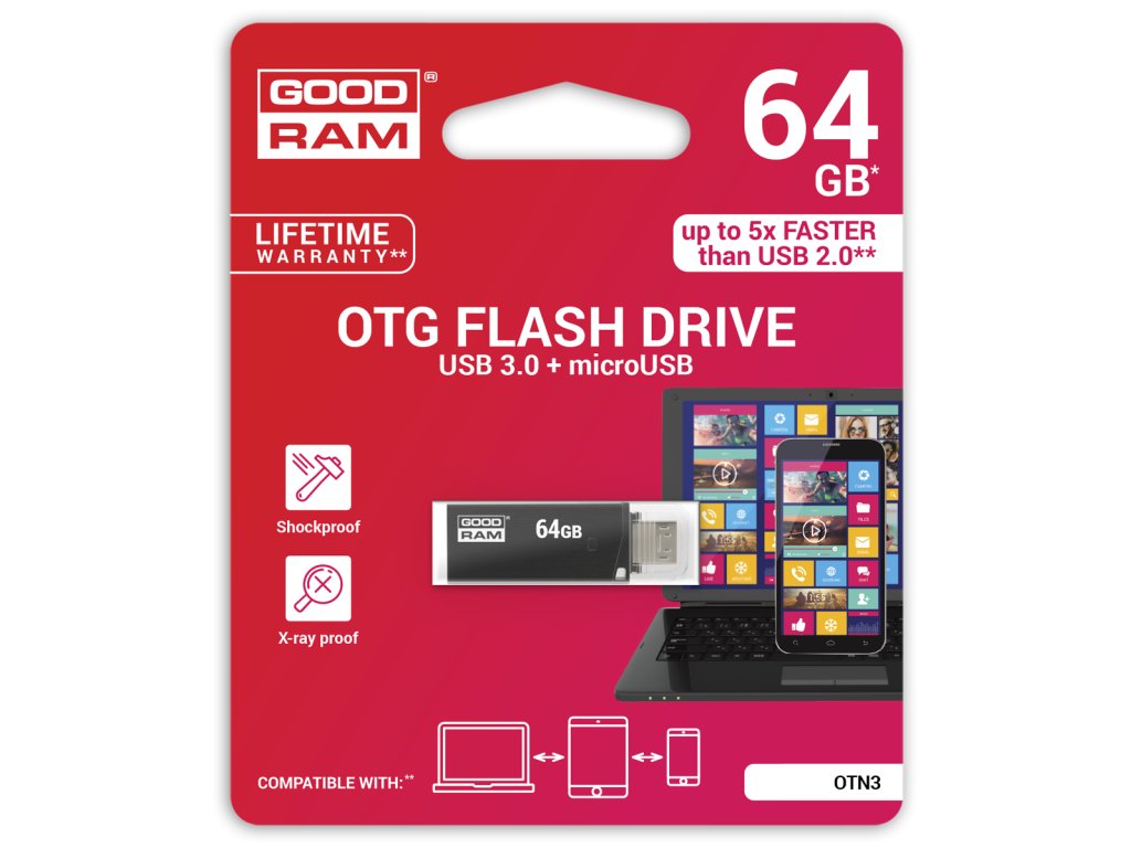 Kapacita: 64 GB Rozhranie: USB 3.0; micro USB (2.0) s funkciou OTG Kompatibilita: Windows 2000 SP4 a novšie, MacOS 10.5.x a novšie, Linux v.2.6.x a novšie Rýchlosť zápisu: do 20 MB/s Rýchlosť čítania: do 60 MB/s Prevádzková teplota: 0°- 70°C Rozmery: 37,2 x 28,1 x 12,9 mm Hmotnosť: 3 gKapacita: 64 GB