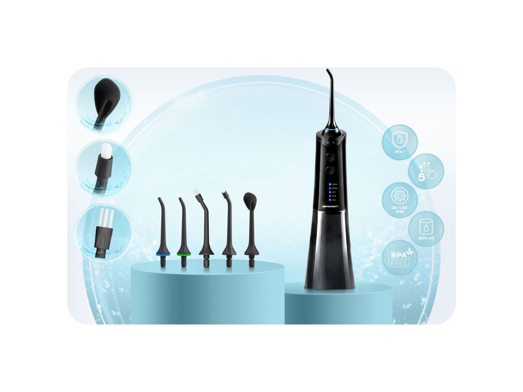 - 5 TIPOV – 2 štandardné trysky, škrabka na jazyk, ortodontický nástavec a postrekovač parodontálnych vreciek