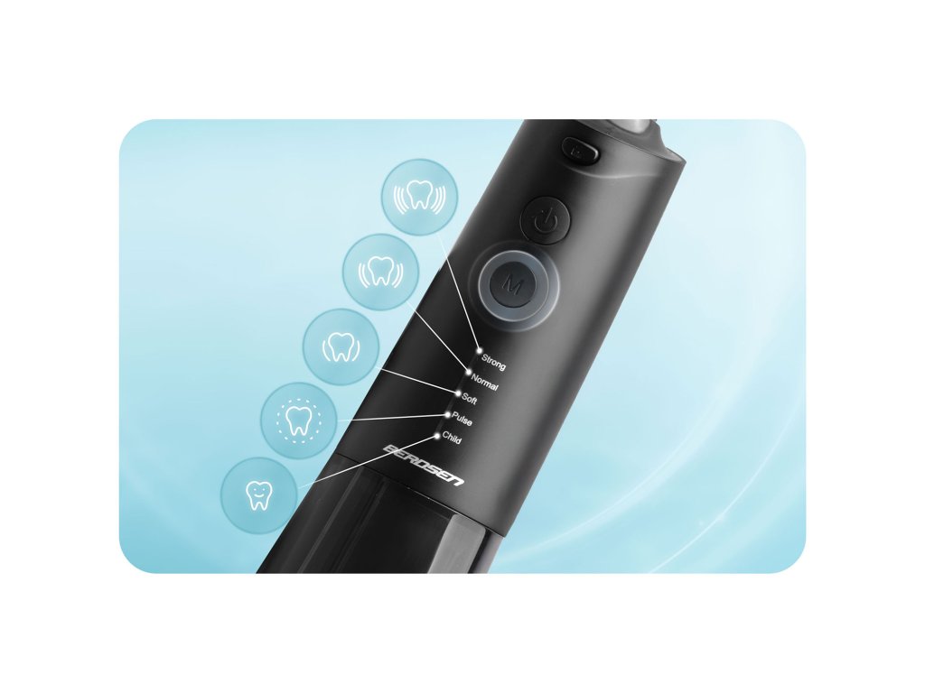 - SOFT - jemný režim s menším tlakom vody . Ideálne pre začiatočníkov a ľudí s odhalenými zubnými krčkami a precitlivenými ďasnami.