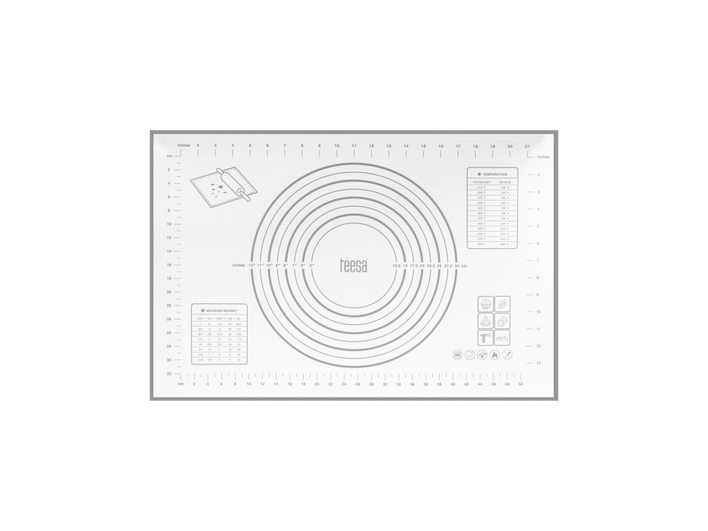 Silikónová doska na pečivo má ďalšiu výhodu. Na jeho povrchu sú užitočné kružnice s vpísanými priemermi a stranami. Pomocou nich môžete napríklad dokonale odmerať cesto na pizzu, aby ste mohli svojich hostí potešiť dokonalou pochúťkou! Nemusíte sa tiež obávať, že budete mať v kuchyni málo úložného priestoru. Po skončení práce podložku jednoducho umyte, zrolujte a uložte do zásuvky.