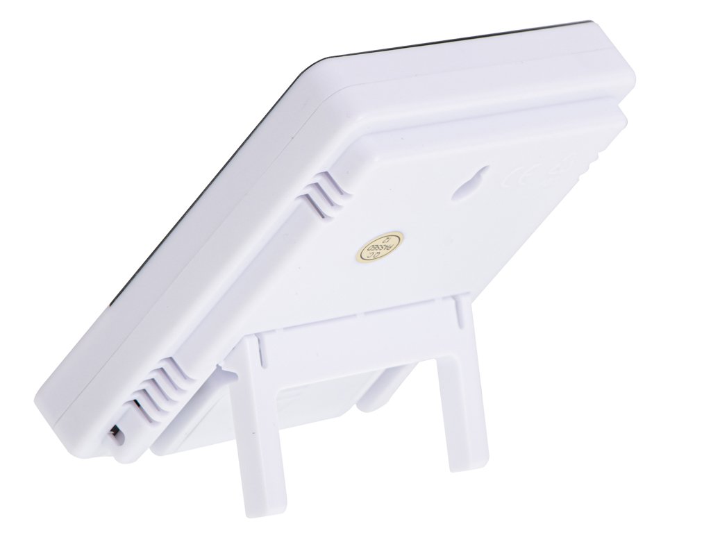 Zariadenie má veľký, ľahko čitateľný displej a praktický stojan, ktorý umožňuje umiestnenie na stôl alebo skrinku. Navyše je na zadnej strane otvor, ktorý uľahčuje zavesenie na stenu.