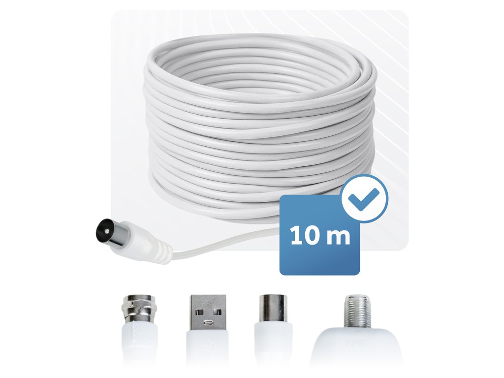 Naša interiérová anténa je vybavená solídnym 10-metrovým káblom, ktorý poskytuje úplnú flexibilitu nastavenia – perfektne ju prispôsobíte tam, kde je signál najsilnejší, nezávisle od umiestnenia televízora.