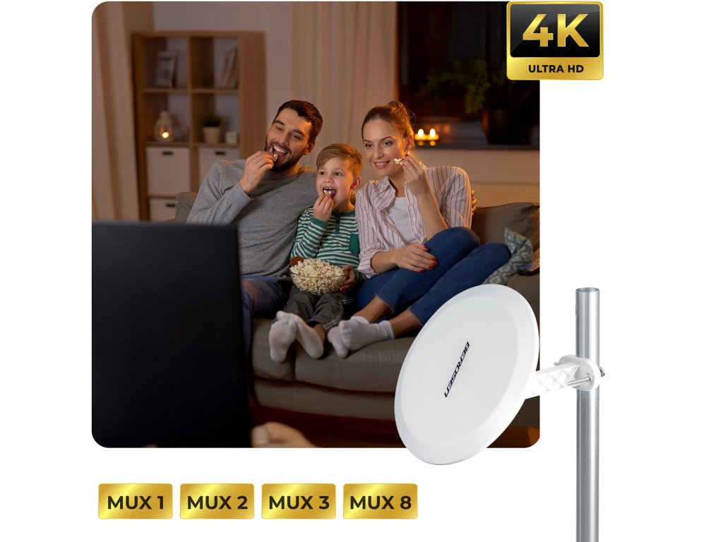 - Aktívna interiérová-exteriérová anténa na príjem pozemnej televízie v 4K kvalite.