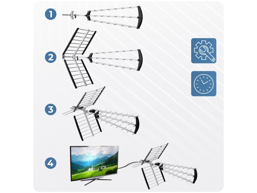 1 Rozložte anténu – skladacia konštrukcia, pripravená na montáž hneď po vybalení z krabice.