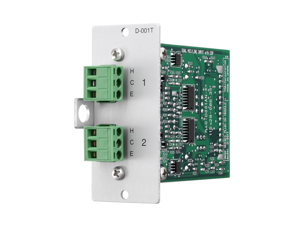 Vstupný modul D-001T bol navrhnutý na spoluprácu s maticou M-9000M2. Má 2 vyvážené 3-pinové vstupné terminály na pripojenie mikrofónov. Modul umožňuje napájanie kondenzátorových mikrofónov pomocou napájania PHANTOM +24V DC.