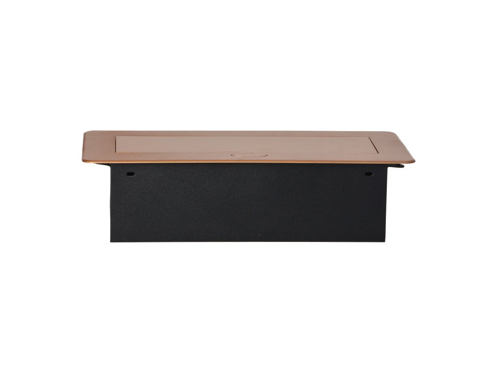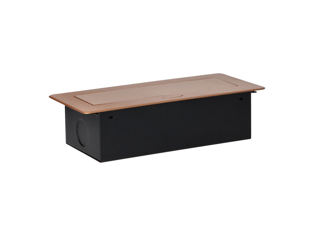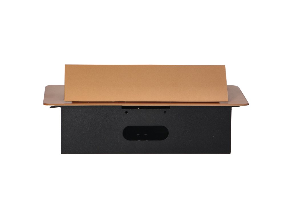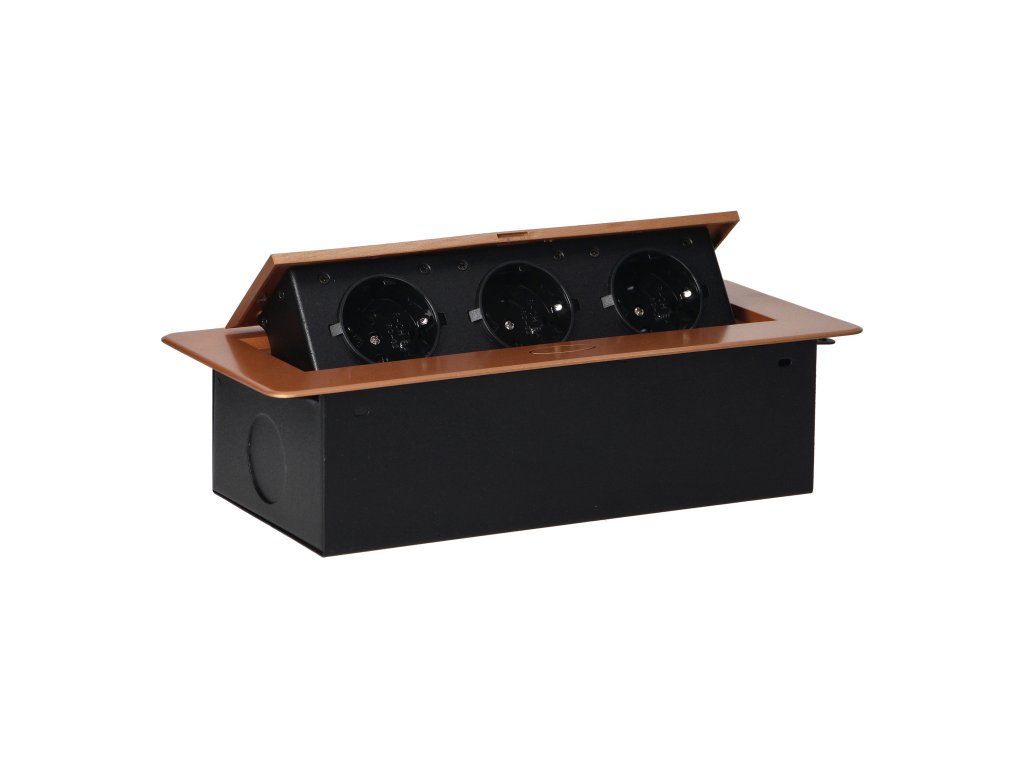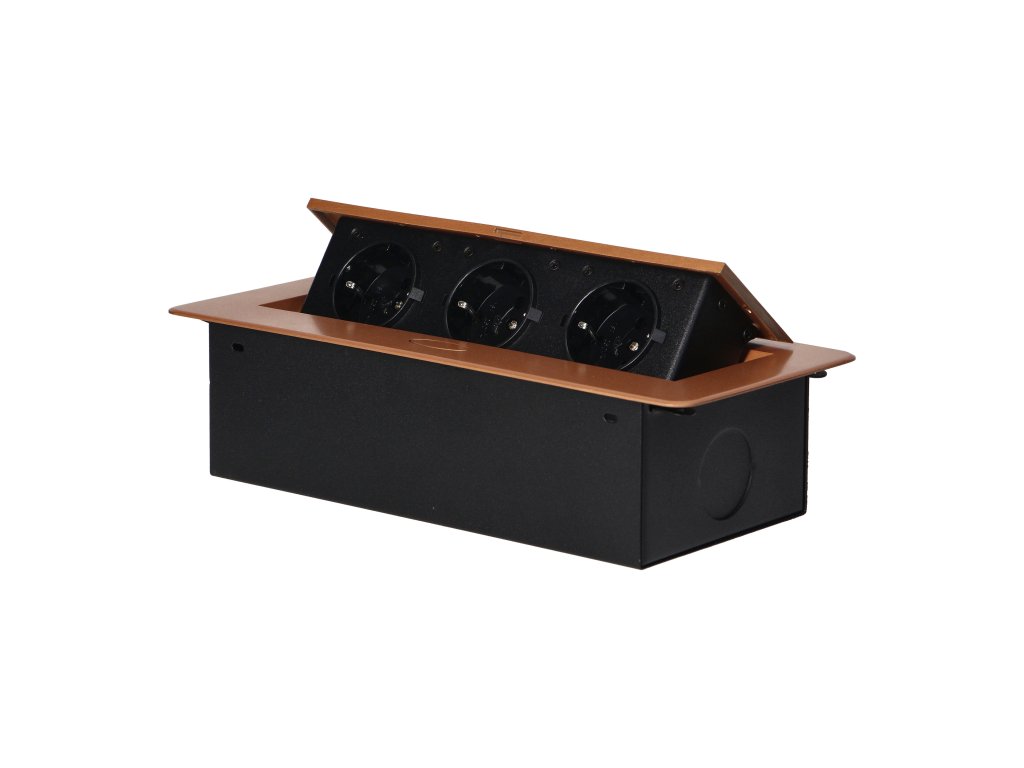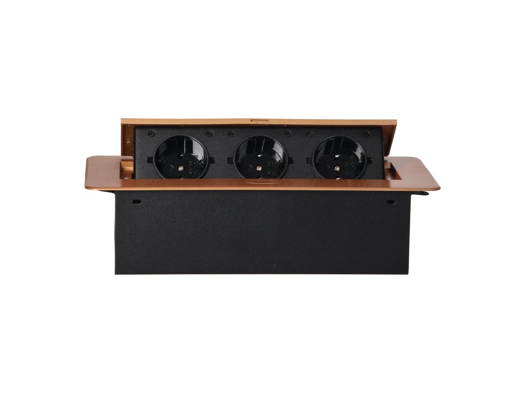 Súprava troch sieťových zásuviek s uzemnením Schuko a prúdovou ochranou v kryte ukrytom v hornej časti. Zariadenie je určené na inštaláciu do písacích stolov, pracovných dosiek a stolov, možno ho namontovať vertikálne aj horizontálne a poskytuje pohodlný prístup k elektrickým zásuvkám. Vďaka plochej hrane (len 2 mm) kryt so zásuvkami dokonale zapadne do povrchu napr. stola a neprekáža pri jeho čistení. Odporúčaný typ kábla - OWY 3 × 1,5 mm² (nie je súčasťou dodávky). Farba: zlatá.Všeobecné informácie: