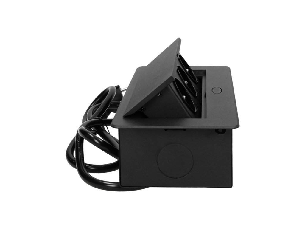 Súprava troch sieťových zásuviek s uzemnením a prúdovou ochranou s maximálnym menovitým výkonom 2500 W. Tieto zásuvky sú umiestnené vo výsuvnom kryte. Zariadenie je určené na inštaláciu do stolov, pracovných dosiek a stolov. Vďaka veľmi plochému a frézovanému okraju vyzerá panel v každej stolovej doske elegantne a nesťažuje čistenie. Zásuvky možno namontovať vertikálne aj horizontálne, čo uľahčuje pripojenie ďalších zariadení k napájaniu. Panel zásuviek sa zatvára a otvára po stlačení. Súprava je vybavená 3 m dlhým káblom. Dostupné farby: čierna, strieborná.Všeobecné informácie: