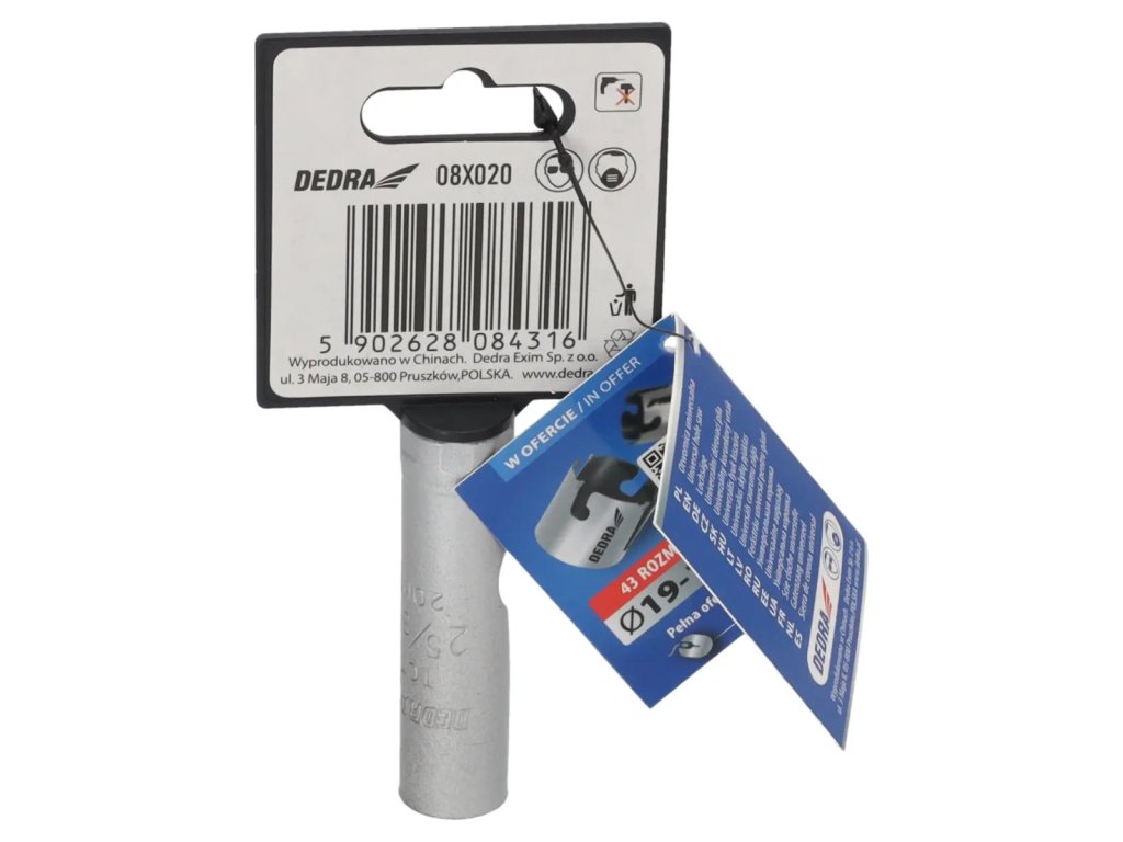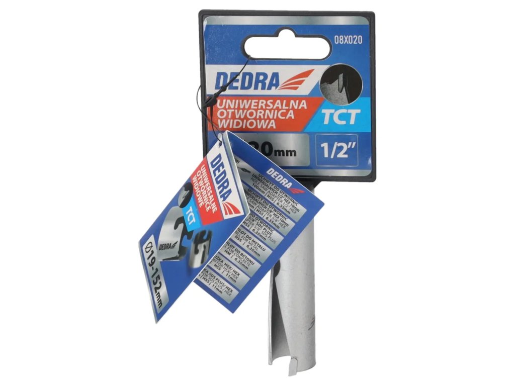 Skutočná veľkosť je uvedená v popise produktu.Univerzálna píla na diery je nepostrádateľným nástrojom v dielni pre domácich majstrov. Špeciálna konštrukciareznej hrany zvyšuje pevnosť píly a zlepšuje vedenie diery.Pomocou skľučovadiel HEX 10 mm 1 /2" 08X001 (odporúčané pre otvory: 08X019-08X030) a 5/8" skľučovadiel 08X002 (odporúčané pre otvory: 08X032-08X152) je možné používať píly na diery na vŕtačkách alebo vŕtačkách.Pomocou skľučovadla SDS+ 08X003 (odporúčanépre otvory: 08X 032 -08X152) je možné používať pílu na otvory DEDRA 08 X widespread s príklepovou vŕtačkou v režime bez príklepu.Na zlepšenie rezného účinku a zvýšenie pevnosti majú otvory niekoľko vidlicových vložiek, ktoré účinne obrábajú materiál.Univerzálnepilotné vrtáky DEDRA 08 X možno s použitím vhodného pilotného vrtáka použiť na prácu v dreve, kovoch, nábytkových doskách, PVC, minerálnych materiáloch, ako sú keramické obkladačky, pórobetón a silikáty.Na zvýšenie pevnosti otvorov je jadro vyrobené z vysokokvalitnejocele HCS č. 45 s hrúbkou 1,5 mm a zuby sú vyrobené z karbidu volfrámu so 6 % kobaltu (volfrámová oceľ YG 6X).Tým sa zlepšuje kvalita a trvanlivosť odrezkov a zvyšuje sa účinnosť vŕtania.