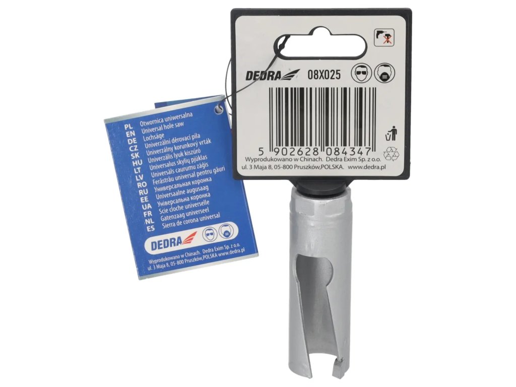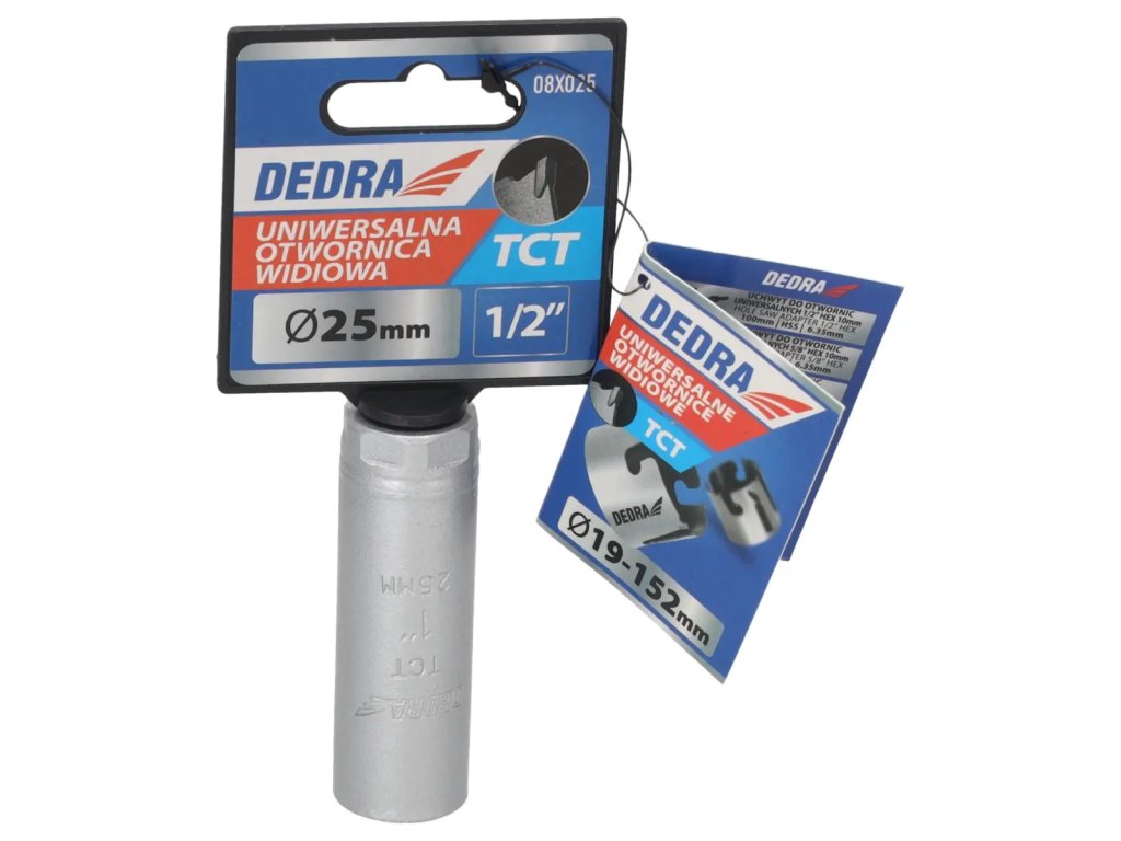 Univerzálna píla na diery je nepostrádateľným nástrojom v dielni pre domácich majstrov. Špeciálna konštrukciareznej hrany zvyšujepevnosť píly a zlepšuje vedenie diery.Pomocou skľučovadiel HEX 10 mm 1 /2" 08X001 (odporúčané pre otvory: 08X019-08X030) a 5/8" skľučovadiel 08X002 (odporúčané pre otvory: 08X032-08X152) je možné používať píly na diery na vŕtačkách alebo vŕtačkách.Pomocou skľučovadla SDS+ 08X003 (odporúčanépre otvory: 08X 032 -08X152) je možné používať pílu na otvory DEDRA 08 X widespread s príklepovou vŕtačkou v režime bez príklepu.Na zlepšenie rezného účinku a zvýšenie pevnosti majú otvory niekoľko vidlicových vložiek, ktoré účinne obrábajú materiál.Univerzálne pilotné vrtáky DEDRA 08 X možno s použitím vhodného pilotného vrtáka použiť na prácu v dreve, kovoch, nábytkových doskách, PVC, minerálnych materiáloch, ako sú keramické obkladačky, pórobetón a silikáty.Na zvýšenie pevnosti otvorov je jadro vyrobené z vysokokvalitnejocele HCS č. 45 s hrúbkou 1,5 mm a zuby sú vyrobené z karbidu volfrámu so 6 % kobaltu (volfrámová oceľ YG 6X).Tým sa zlepšuje kvalita a trvanlivosť odrezkov a zvyšuje sa účinnosť vŕtania.