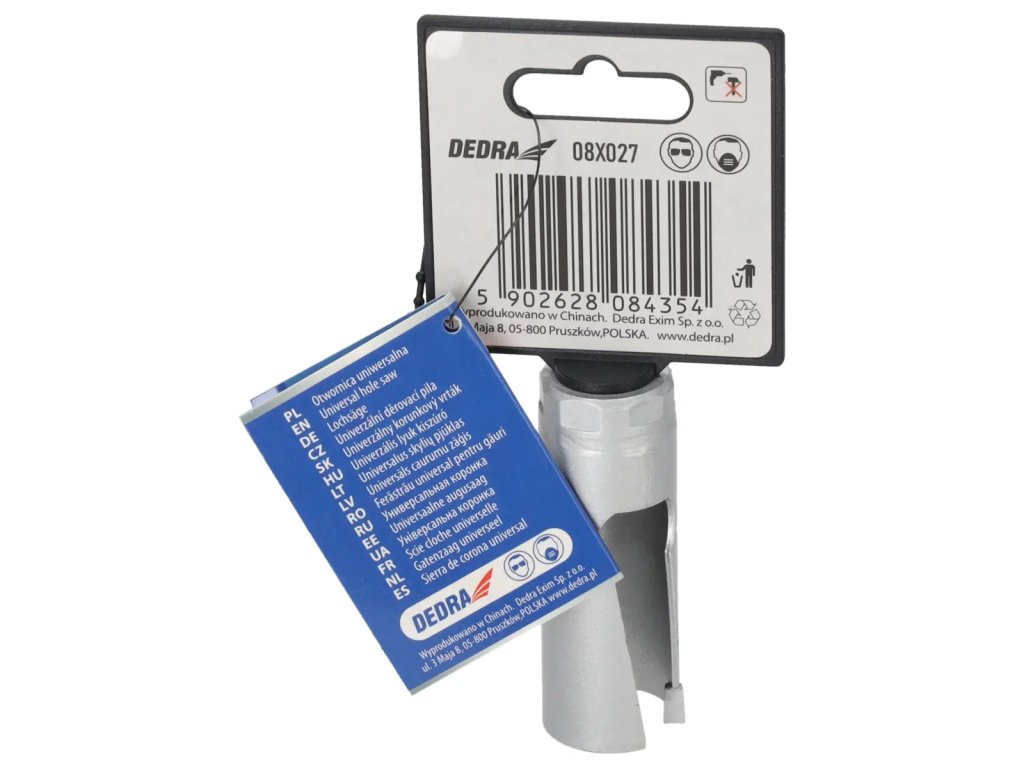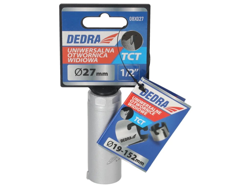 Skutočná veľkosť je uvedená v popise produktu.Univerzálna píla na diery je nepostrádateľným nástrojom vdielni pre domácich majstrov. Špeciálna konštrukcia reznej hrany zvyšuje pevnosť píly a zlepšuje vedenie diery.S použitím skľučovadiel HEX 10 mm 1 /2" 08X001 (odporúčané pre otvory: 08X019-08X030) a 5/8" skľučovadiel 08X002 (odporúčané pre otvory: 08X032-08X152) je možné používať píly na diery na vŕtačkách alebo vŕtačkách.Pomocou skľučovadla SDS+ 08X003 (odporúčanépre otvory: 08X 032 -08X152) je možné používať pílu na otvory DEDRA 08 X widespread s príklepovou vŕtačkou v režime bez príklepu.Na zlepšenie rezného účinku a zvýšenie pevnosti majú otvory niekoľko vidlicových vložiek, ktoré účinne obrábajú materiál.Univerzálne pilotné vrtáky DEDRA 08 X možno s použitím vhodného pilotného vrtáka použiť na prácu v dreve, kovoch, nábytkových doskách,PVC, minerálnych materiáloch, ako sú keramické obkladačky, pórobetón a silikáty.Na zvýšenie pevnosti otvorov je jadro vyrobené z vysokokvalitnejocele HCS č. 45 s hrúbkou 1,5 mm a zuby sú vyrobené z karbidu volfrámu so 6 % kobaltu (volfrámová oceľ YG 6X).Tým sa zlepšuje kvalita a trvanlivosť odrezkov a zvyšuje sa účinnosť vŕtania.