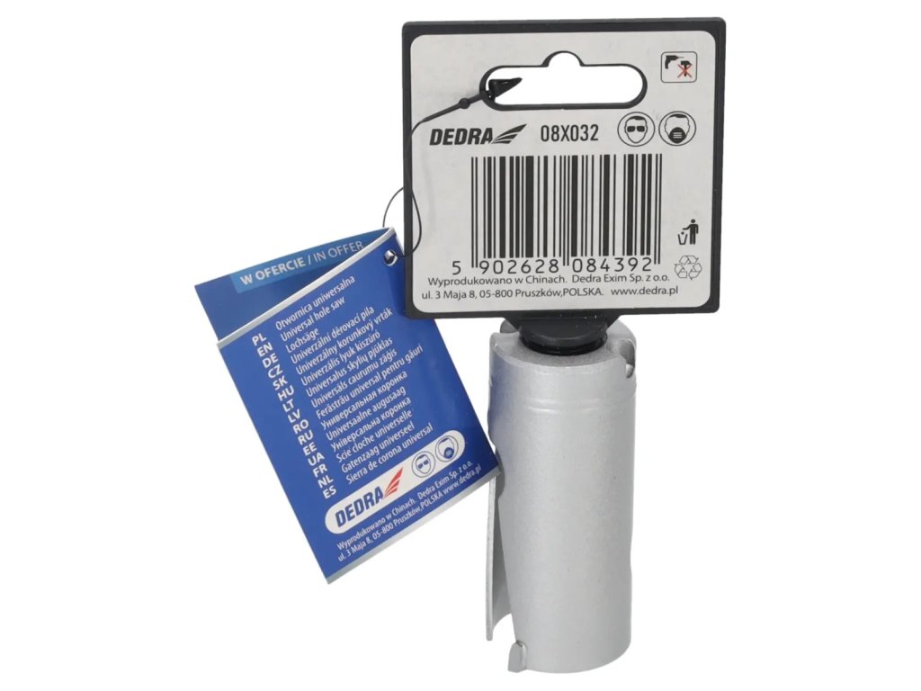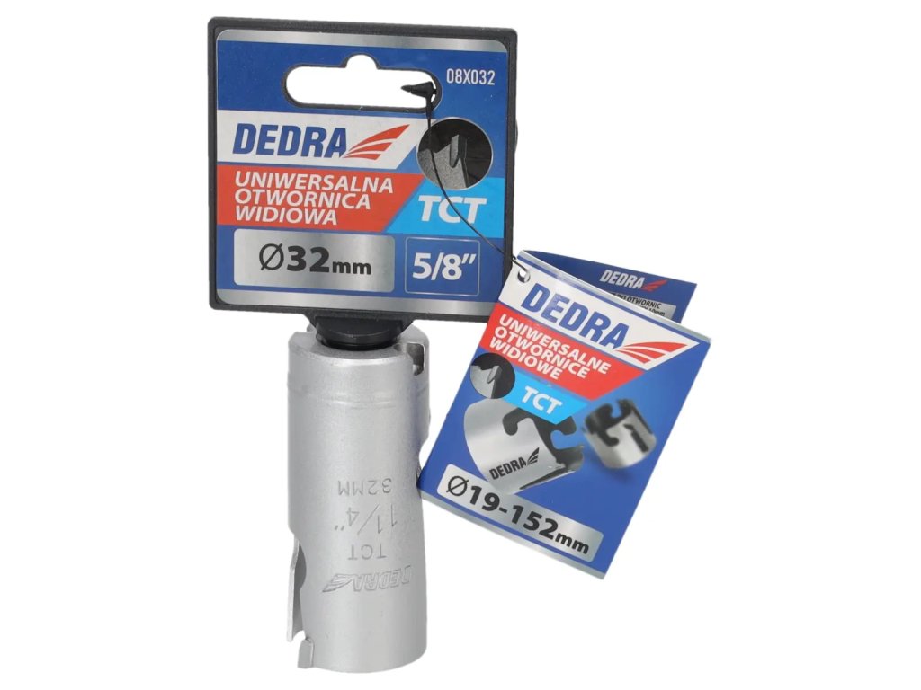 Skutočná veľkosť je uvedená v popise produktu.Univerzálna píla na diery je nepostrádateľným nástrojom v dielni pre domácich majstrov. Špeciálna konštrukciareznej hrany zvyšuje pevnosť píly azlepšuje vedenie diery.S použitím skľučovadiel HEX 10 mm 1 /2" 08X001 (odporúčané pre otvory: 08X019-08X030) a 5/8" skľučovadiel 08X002 (odporúčané pre otvory: 08X032-08X152) je možné používať píly na diery na vŕtačkách alebo vŕtačkách.Pomocou skľučovadla SDS+ 08X003 (odporúčanépre otvory: 08X 032 -08X152) je možné používať pílu na otvory DEDRA 08 X widespread s príklepovou vŕtačkou v režime bez príklepu.Na zlepšenie rezného účinku a zvýšenie pevnosti majú otvory niekoľko vidlicových vložiek,ktoré účinne obrábajú materiál.Univerzálne pilotné vrtáky DEDRA 08 X možno s použitím vhodného pilotného vrtáka použiť na prácu v dreve, kovoch, nábytkových doskách, PVC, minerálnych materiáloch, ako sú keramické obkladačky, pórobetón a silikáty.Na zvýšenie pevnosti otvorov je jadro vyrobené z vysokokvalitnejocele HCS č. 45 s hrúbkou 1,5 mm a zuby sú vyrobené z karbidu volfrámu so 6 % kobaltu (volfrámová oceľ YG 6X).Tým sa zlepšuje kvalita a trvanlivosť odrezkov a zvyšuje sa účinnosť vŕtania.