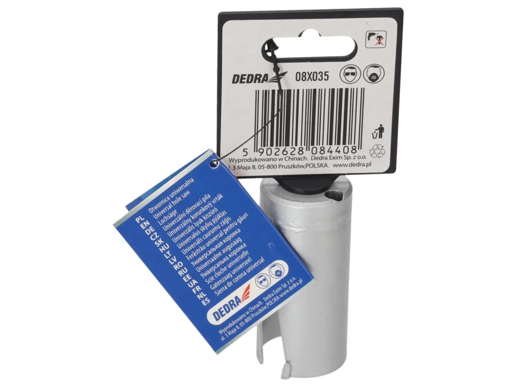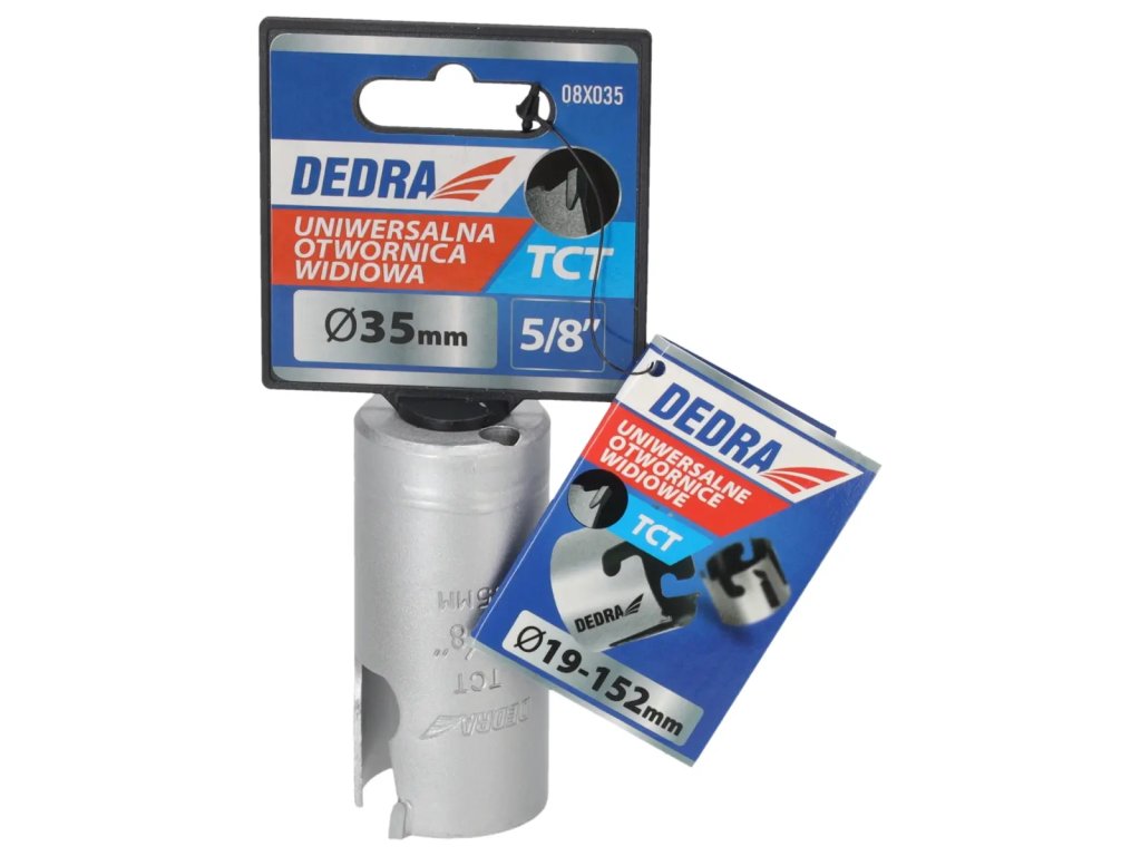 Univerzálna píla na diery je nepostrádateľným nástrojom v dielni pre domácich majstrov. Špeciálna konštrukciareznej hrany zvyšuje pevnosť píly a zlepšuje vedenie diery.Pomocou skľučovadiel HEX 10 mm 1 /2" 08X001 (odporúčané pre otvory: 08X019-08X030) a 5/8" skľučovadiel 08X002 (odporúčané pre otvory: 08X032-08X152) je možné používať píly na diery na vŕtačkách alebo vŕtačkách.Pomocou skľučovadla SDS+ 08X003 (odporúčanépre otvory: 08X 032 -08X152) je možné používať pílu na otvory DEDRA 08 X widespread s príklepovou vŕtačkou v režime bez príklepu.Na zlepšenie rezného účinku a zvýšenie pevnosti majú otvory niekoľkovidlicových vložiek, ktoré účinne obrábajú materiál.Univerzálne pilotné vrtáky DEDRA 08 X možno s použitím vhodného pilotného vrtáka použiť na prácu v dreve, kovoch, nábytkových doskách, PVC, minerálnych materiáloch, ako sú keramické obkladačky,pórobetón a silikáty.Na zvýšenie pevnosti otvorov je jadro vyrobené z vysokokvalitnejocele HCS č. 45 s hrúbkou 1,5 mm a zuby sú vyrobené z karbidu volfrámu so 6 % kobaltu (volfrámová oceľ YG 6X).Tým sa zlepšuje kvalita a trvanlivosť odrezkov a zvyšuje sa účinnosť vŕtania.