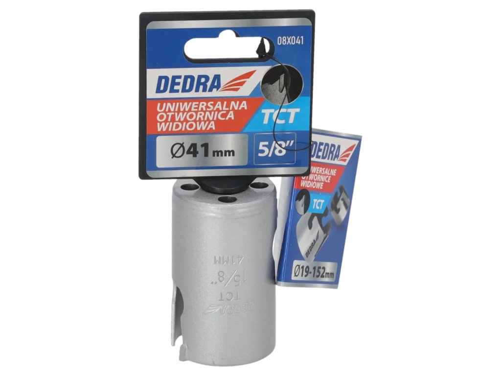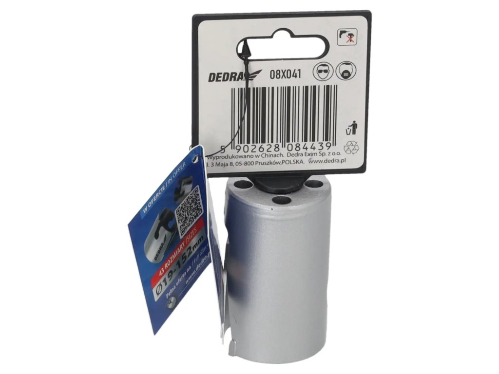 Skutočná veľkosť je uvedená v popise produktu.Univerzálna píla na diery je nepostrádateľným nástrojom v dielni pre domácich majstrov. Špeciálna konštrukcia reznej hrany zvyšuje pevnosť píly a zlepšuje vedenie diery.Pomocou skľučovadiel HEX 10 mm 1 /2" 08X001 (odporúčané pre otvory: 08X019-08X030) a 5/8" skľučovadiel 08X002 (odporúčané pre otvory: 08X032-08X152) je možné používať píly na diery na vŕtačkách alebo vŕtačkách.Pomocou skľučovadla SDS+ 08X003 (odporúčanépre otvory: 08X 032 -08X152) je možné používať pílu na otvory DEDRA 08 X widespread s príklepovou vŕtačkou v režime bez príklepu.Na zlepšenie rezného účinku a zvýšenie pevnosti majú otvory niekoľko vidlicových vložiek, ktoré účinne obrábajú materiál.Univerzálne pilotné vrtáky DEDRA 08 X možno s použitím vhodného pilotného vrtáka použiť na prácu v dreve, kovoch, nábytkových doskách, PVC, minerálnych materiáloch, ako sú keramickéobkladačky, pórobetón a silikáty.Na zvýšenie pevnosti otvorov je jadro vyrobené z vysokokvalitnejocele HCS č. 45 s hrúbkou 1,5 mm a zuby sú vyrobené z karbidu volfrámu so 6 % kobaltu (volfrámová oceľ YG 6X).Tým sa zlepšuje kvalita a trvanlivosť odrezkova zvyšuje sa účinnosť vŕtania.