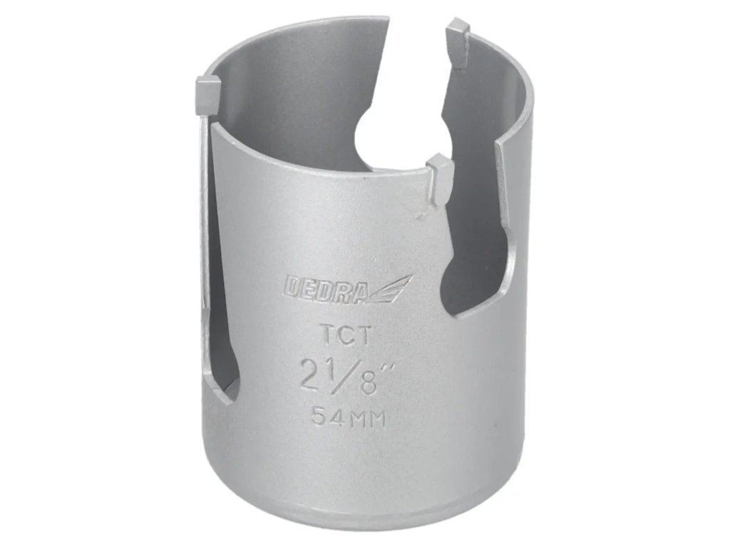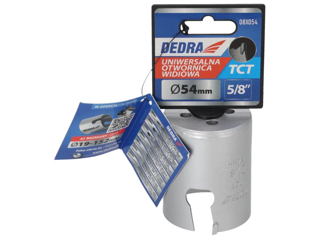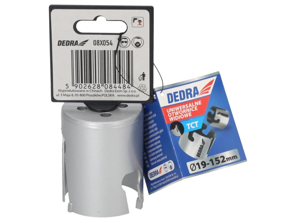 Veľkosť zobrazená nafotografii je príklad.Univerzálna píla na diery je nepostrádateľným nástrojom v dielni pre domácich majstrov. Špeciálna konštrukciareznej hrany zvyšuje pevnosť píly a zlepšuje vedenie diery.Pomocou skľučovadiel HEX 10 mm 1 /2" 08X001 (odporúčané pre otvory: 08X019-08X030) a 5/8" skľučovadiel 08X002 (odporúčané pre otvory: 08X032-08X152) je možné používať píly na diery s vŕtačkami alebo vŕtačkami.Pomocou skľučovadla SDS+ 08X003 (odporúčanépre otvory: 08X 032 - 08X152)je možné používať pílu na otvory DEDRA 08 X widespread s príklepovou vŕtačkou v režime bez príklepu.Na zlepšenie rezného účinku a zvýšenie pevnosti majú otvory niekoľko vidlicových vložiek, ktoré účinne obrábajú materiál.Univerzálne pilotné vrtáky DEDRA 08 X možno s použitím vhodného pilotného vrtáka použiť na prácu v dreve, kovoch, nábytkových doskách, PVC, minerálnych materiáloch, ako sú keramické obkladačky, pórobetón a silikáty.Na zvýšenie pevnosti otvorov je jadro vyrobené z vysokokvalitnejocele HCS č. 45 s hrúbkou 1,5 mm a zuby sú vyrobené z karbidu volfrámu so 6 % kobaltu (volfrámová oceľ YG 6X).Tým sa zlepšuje kvalita a trvanlivosť odrezkov a zvyšuje sa účinnosť vŕtania.