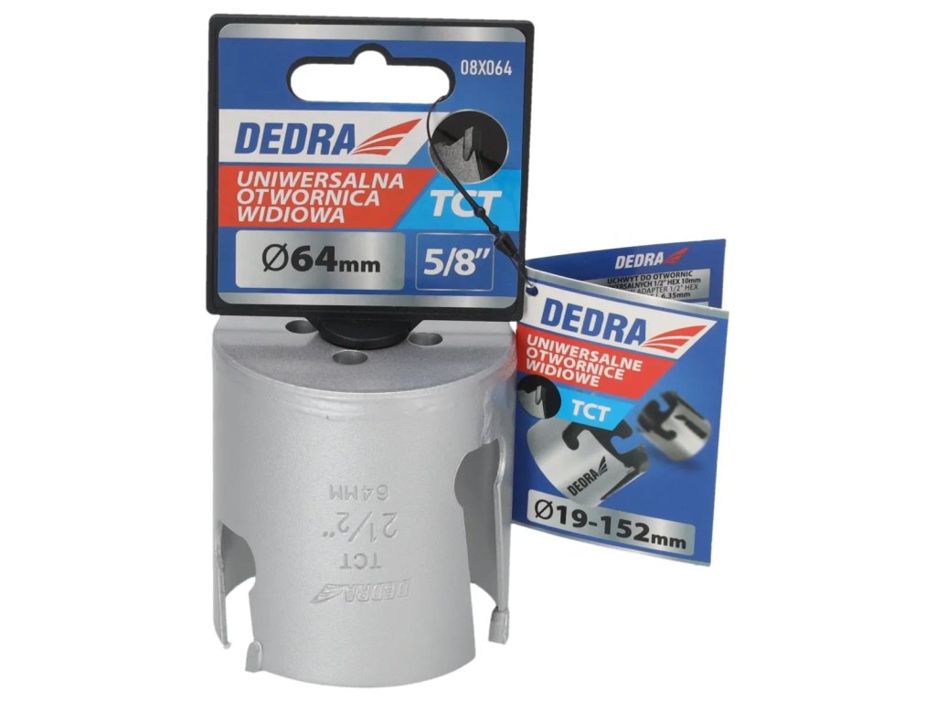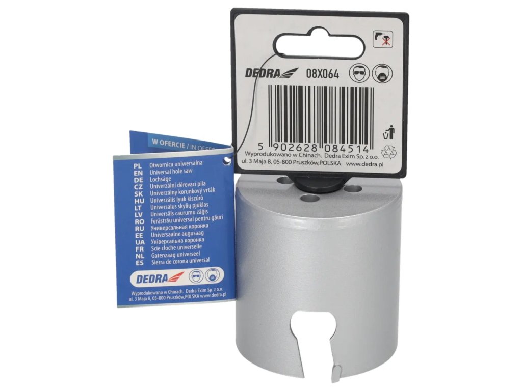 Skutočná veľkosť je uvedená v popise produktu.Univerzálna píla na diery je nepostrádateľným nástrojom v dielni pre domácich majstrov. Špeciálna konštrukciareznej hrany zvyšuje pevnosť píly a zlepšuje vedenie diery.S použitím skľučovadiel HEX 10 mm 1 /2" 08X001 (odporúčané pre otvory: 08X019-08X030) a 5/8" skľučovadiel 08X002 (odporúčané pre otvory: 08X032-08X152) je možné používať píly na diery na vŕtačkách alebo vŕtačkách.Pomocou skľučovadla SDS+ 08X003 (odporúčanépre otvory: 08X 032 -08X152) je možné používať pílu na otvory DEDRA 08 X widespread s príklepovou vŕtačkou v režime bez príklepu.Na zlepšenie rezného účinku a zvýšenie pevnosti majú otvory niekoľkovidlicových vložiek, ktoré účinne obrábajú materiál.Univerzálne pilotné vrtáky DEDRA 08 X možno s použitím vhodného pilotného vrtáka použiť na prácu v dreve, kovoch, nábytkových doskách, PVC, minerálnych materiáloch, ako sú keramické obkladačky, pórobetón a silikáty.Na zvýšenie pevnosti otvorov je jadro vyrobené z vysokokvalitnejocele HCS č. 45 s hrúbkou 1,5 mm a zuby sú vyrobené z karbidu volfrámu so 6 % kobaltu (volfrámová oceľ YG 6X).Tým sa zlepšuje kvalita a trvanlivosť odrezkov a zvyšuje sa účinnosť vŕtania.