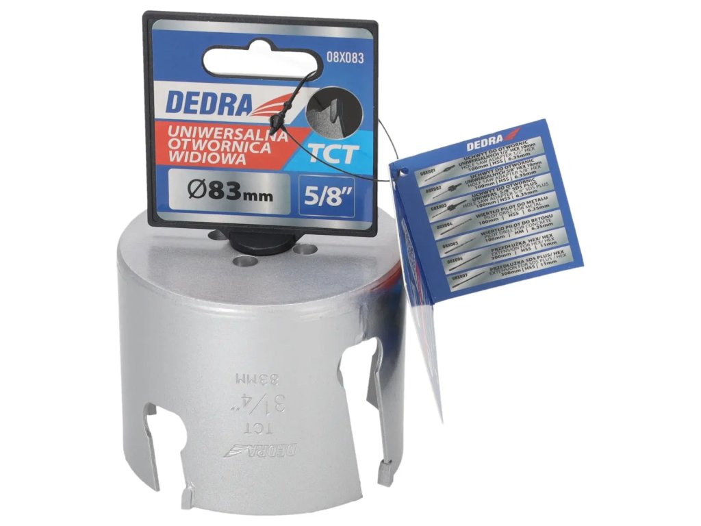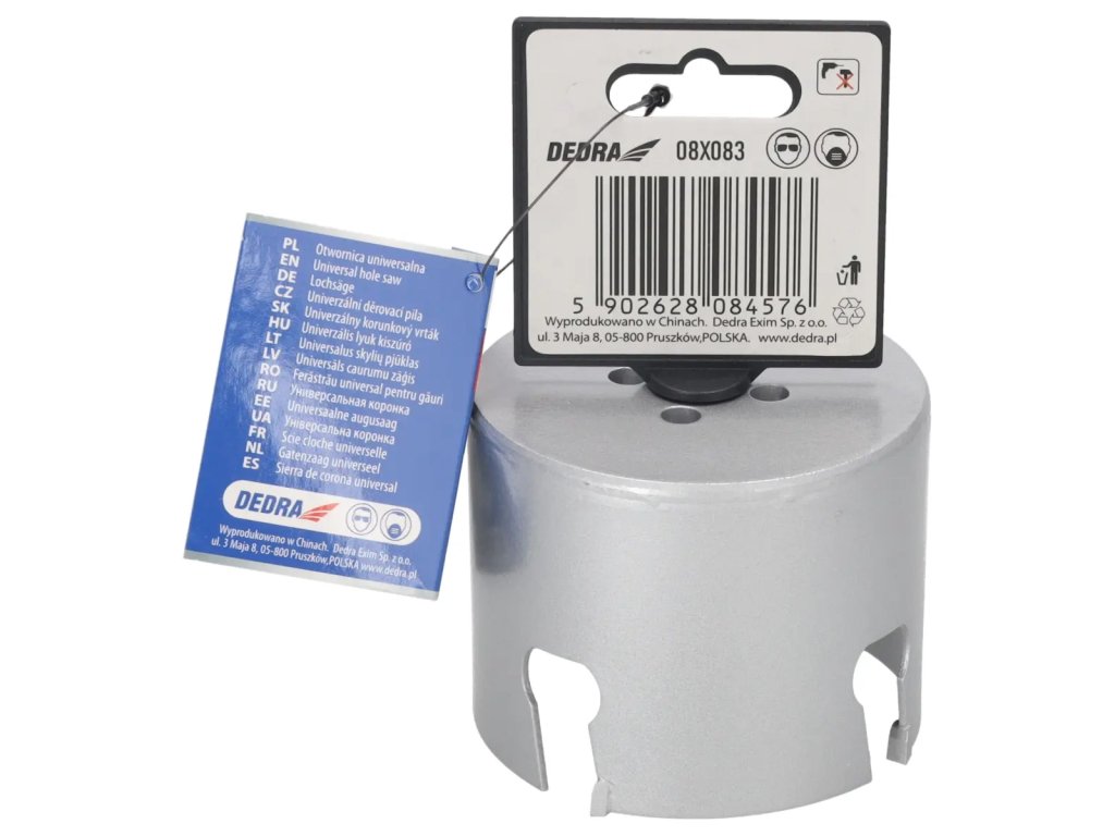 Skutočná veľkosť je uvedená v popiseproduktu.Univerzálna píla na diery je nepostrádateľným nástrojom v dielni pre domácich majstrov. Špeciálna konštrukciareznej hrany zvyšuje pevnosť píly a zlepšuje vedenie diery.Pomocou skľučovadiel HEX 10 mm 1 /2" 08X001 (odporúčané pre otvory: 08X019-08X030) a 5/8" skľučovadiel 08X002 (odporúčané pre otvory: 08X032-08X152) je možné používať píly na diery na vŕtačkách alebo vŕtačkách.Pomocou skľučovadla SDS+ 08X003 (odporúčanépre otvory: 08X 032 -08X152) je možné používať pílu na otvory DEDRA 08 X widespread s príklepovou vŕtačkou v režime bez príklepu.Na zlepšenie rezného účinku a zvýšenie pevnosti majú otvory niekoľko vidlicových vložiek, ktoré účinne obrábajú materiál.Univerzálne pilotné vrtáky DEDRA 08 X možno s použitím vhodného pilotného vrtáka použiť na prácu v dreve, kovoch, nábytkových doskách, PVC, minerálnych materiáloch, ako sú keramické obkladačky, pórobetón a silikáty.Na zvýšenie pevnosti otvorov je jadro vyrobené z vysokokvalitnejocele HCS č. 45 s hrúbkou 1,5 mm a zuby sú vyrobené z karbidu volfrámu so 6 % kobaltu (volfrámová oceľ YG 6X).Tým sa zlepšuje kvalita a trvanlivosť odrezkov a zvyšuje sa účinnosť vŕtania.