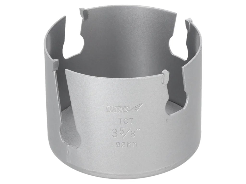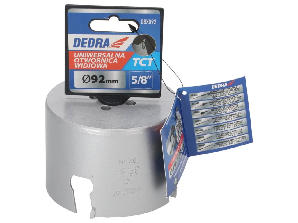 Univerzálna píla na diery jenepostrádateľným nástrojom v dielni pre domácich majstrov. Špeciálna konštrukcia reznej hrany zvyšuje pevnosť píly a zlepšujevedenie diery.S použitím skľučovadiel HEX 10 mm 1 /2" 08X001 (odporúčané pre otvory: 08X019-08X030) a 5/8" skľučovadiel 08X002 (odporúčané pre otvory: 08X032-08X152) je možné používať píly na diery na vŕtačkách alebo vŕtačkách.Pomocou skľučovadla SDS+ 08X003 (odporúčanépre otvory: 08X 032 -08X152) je možné používať pílu na otvory DEDRA 08 X widespread s príklepovou vŕtačkou v režime bez príklepu.Na zlepšenie rezného účinku a zvýšenie pevnosti majú otvory niekoľko vidlicových vložiek, ktoré účinne obrábajú materiál.Univerzálne pilotné vrtáky DEDRA 08 X možno s použitím vhodného pilotného vrtáka použiť na prácu v dreve,kovoch, nábytkových doskách, PVC, minerálnych materiáloch, ako sú keramické obkladačky, pórobetón a silikáty.Na zvýšenie pevnosti otvorov je jadro vyrobené z vysokokvalitnejocele HCS č. 45 s hrúbkou 1,5 mm a zuby sú vyrobené z karbidu volfrámu so 6 % kobaltu (volfrámová oceľ YG 6X).Tým sa zlepšuje kvalita a trvanlivosť odrezkov a zvyšuje sa účinnosť vŕtania.