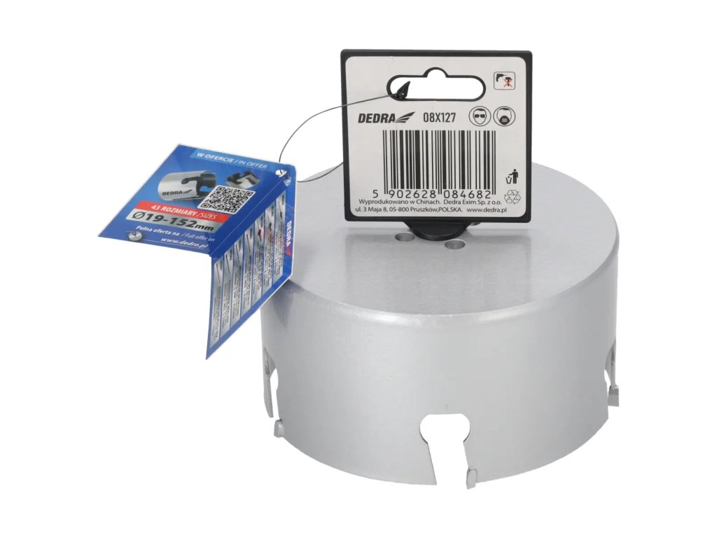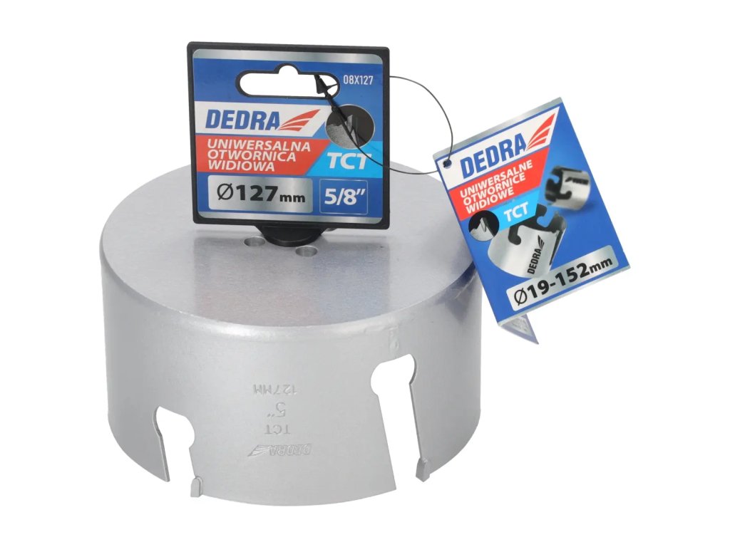 Univerzálna píla na diery je nepostrádateľným nástrojom v dielni pre domácich majstrov. Špeciálna konštrukciareznej hrany zvyšuje pevnosť píly a zlepšuje vedeniediery.Pomocou skľučovadiel HEX 10 mm 1 /2" 08X001 (odporúčané pre otvory: 08X019-08X030) a 5/8" skľučovadiel 08X002 (odporúčané pre otvory: 08X032-08X152) je možné používať píly na diery na vŕtačkách alebo vŕtačkách.Pomocou skľučovadla SDS+ 08X003 (odporúčanépre otvory: 08X 032 -08X152) je možné používať pílu na otvory DEDRA 08 X widespread s príklepovou vŕtačkou v režime bez príklepu.Na zlepšenie rezného účinku a zvýšenie pevnosti majú otvory niekoľko vidlicových vložiek, ktoré účinne obrábajú materiál.Univerzálne pilotné vrtáky DEDRA 08 X možno s použitím vhodného pilotného vrtáka použiť na prácu v dreve, kovoch, nábytkových doskách, PVC, minerálnych materiáloch, ako sú keramické obkladačky, pórobetón a silikáty.Na zvýšenie pevnosti otvorov je jadro vyrobené z vysokokvalitnejocele HCS č. 45 s hrúbkou 1,5 mm a zuby sú vyrobené z karbidu volfrámu so 6 % kobaltu (volfrámová oceľ YG 6X).Tým sa zlepšuje kvalita a trvanlivosť odrezkov a zvyšuje sa účinnosť vŕtania.
