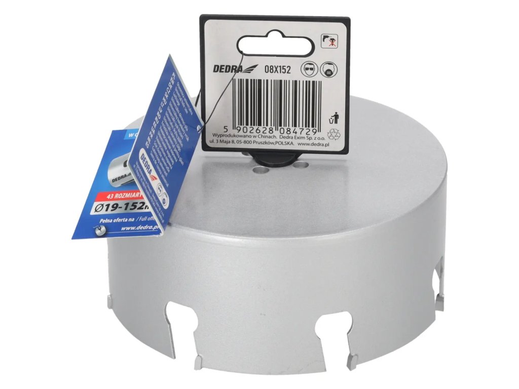 Veľkosťzobrazená na fotografii je príkladom.Univerzálna píla na diery je nepostrádateľným nástrojom v dielni pre domácich majstrov. Špeciálna konštrukcia reznej hrany zvyšuje pevnosť píly a zlepšuje vedenie diery.Pomocou skľučovadiel HEX 10 mm 1 /2" 08X001 (odporúčané pre otvory: 08X019-08X030) a 5/8" skľučovadiel 08X002 (odporúčané pre otvory: 08X032-08X152) je možné používať píly na diery na vŕtačkách alebo vŕtačkách.Pomocou skľučovadla SDS+ 08X003 (odporúčanépre otvory: 08X 032 -08X152) je možné používať pílu na otvory DEDRA 08 X widespread s príklepovou vŕtačkou v režime bez príklepu.Na zlepšenie rezného účinku a zvýšenie pevnosti majú otvory niekoľko vidlicových vložiek, ktoré účinne obrábajú materiál.Univerzálne pilotné vrtáky DEDRA 08 X možno s použitím vhodného pilotného vrtáka použiť na prácu v dreve, kovoch, nábytkových doskách, PVC, minerálnych materiáloch, ako sú keramické obkladačky, pórobetón a silikáty.Na zvýšenie pevnosti otvorov je jadro vyrobené z vysokokvalitnejocele HCS č. 45 s hrúbkou 1,5 mm a zuby sú vyrobené z karbidu volfrámu so 6 % kobaltu (volfrámová oceľ YG 6X).Tým sa zlepšuje kvalita a trvanlivosť odrezkov a zvyšuje sa účinnosť vŕtania.