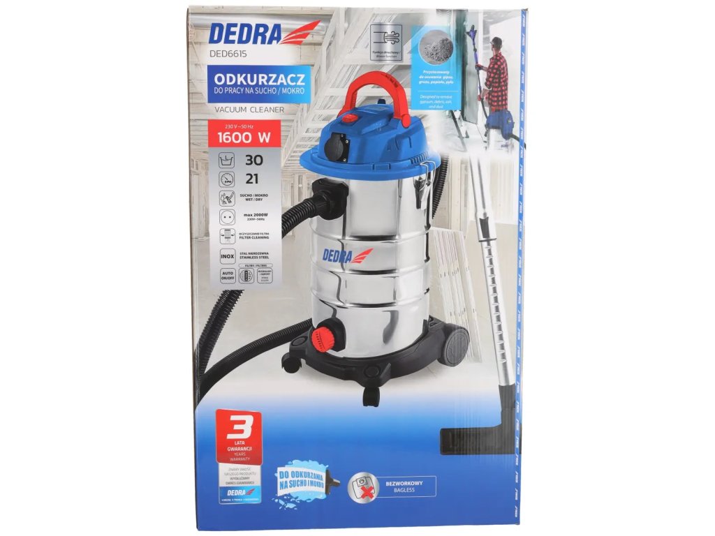 Vysávač DEDRA DED6615 je všestranné zariadenie, ktoré sa osvedčí ako v domácnosti, tak aj v garáži či dielni.