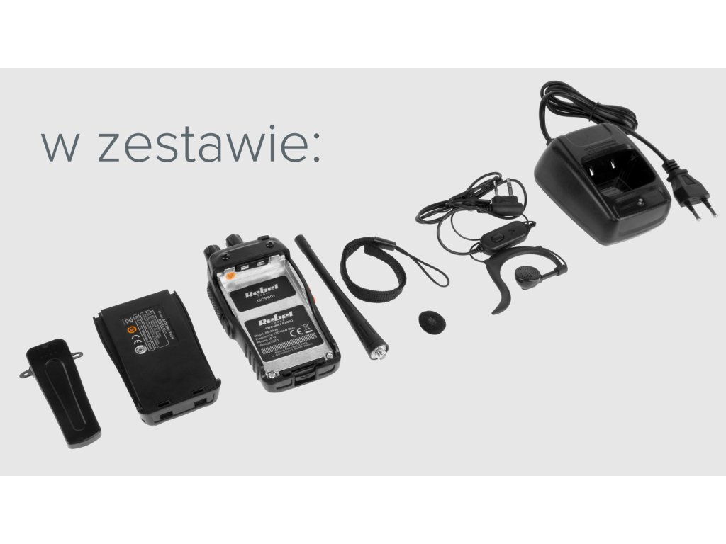 Súčasťou balenia: anténa, nabíjacia stanica, spona na opasok, návod na použitie, vysielačka x1ks