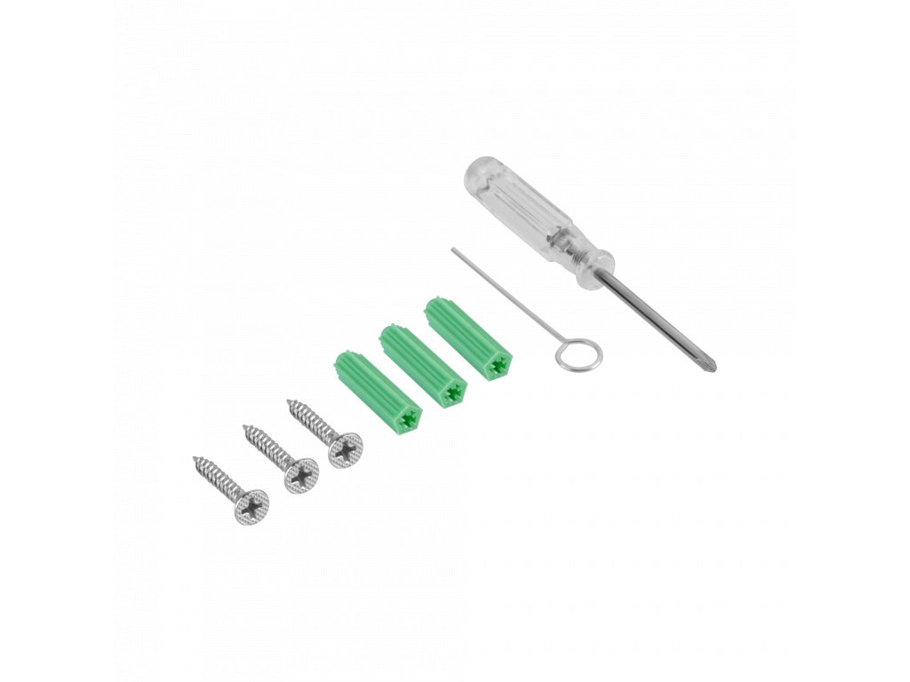 Súčasťou balenia: sieťový adaptér (1 m), montážne kolíky, skrutky, kľúč