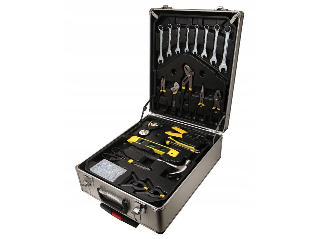Súprava náradia v kufríku uzamykateľnom na kľúč. Zabudované kolieska na jednoduchý pohyb kufra a teleskopická rukoväť. Dokonale vyrobený kufor na náradie. Celá súprava vyrobená v robustnej kvalite. Hliníkový kufor s kolieskami a teleskopickou vysúvacou rukoväťou na prepravu súpravy (ako cestovný kufor). Štyri výsuvné zásuvky na náradie.
