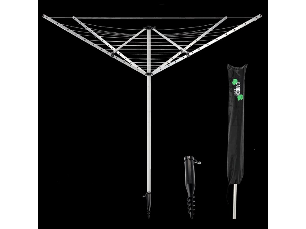 4-ramenná, otočná záhradná sušička. Zaručuje 50 m PVC šnúry, čo znamená plochu na sušenie prádla. Použitie vysokokvalitných materiálov zaručuje, že je odolná voči poveternostným podmienkam. Veľmi rýchla montáž a rovnako jednoduché skladanie. Možnosť nastavenia výšky. Kotva a kryt v súprave.Rozmery: