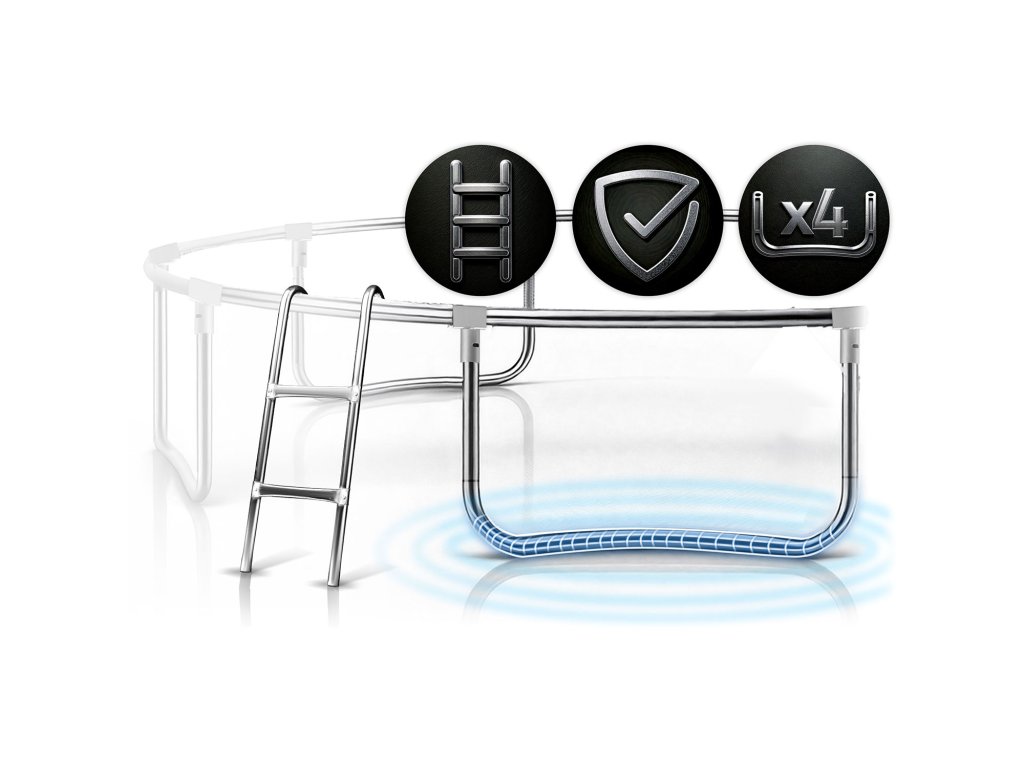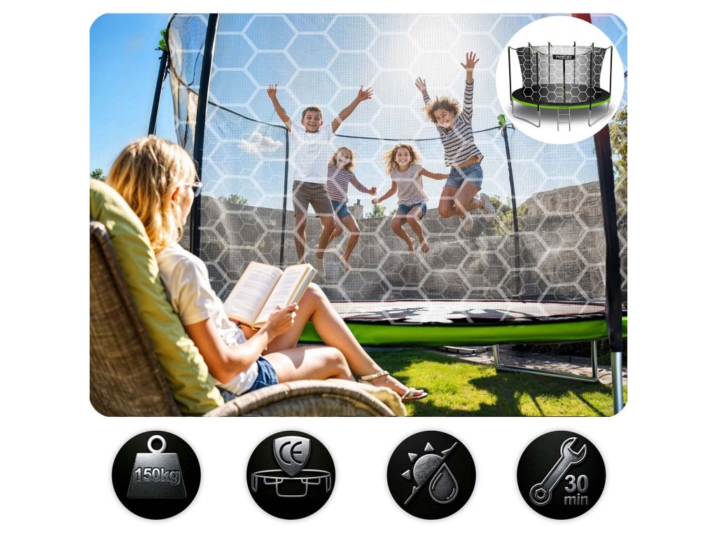 Hlavné vlastnosti priemer (s tyčami) 435 cm - 14ft sieť vonkajšia výška trampolíny 70 cm výška siete 180 cm počet tyčí 8 ks počet pružín 80 ks maximálne zaťaženie 150 kg
