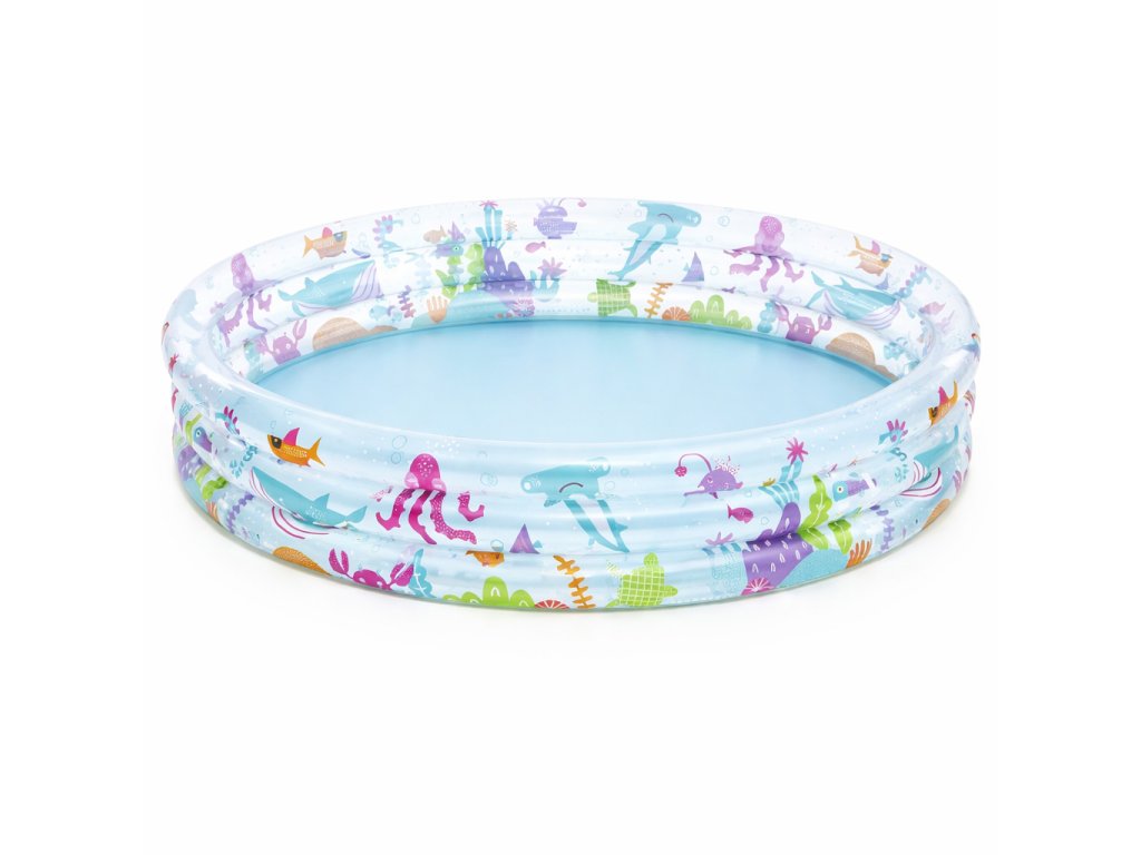 Ten uroczy, dmuchany basen został zaprojektowany z myślą o najmłodszych użytkownikach (2+), oferując bezpieczną, komfortową i pełną kolorów przestrzeń do zabawy. Trzy równe pierścienie oraz efektowna grafika podwodnego świata pobudzają wyobraźnię i zachęcają do aktywnej zabawy przez cały dzień.