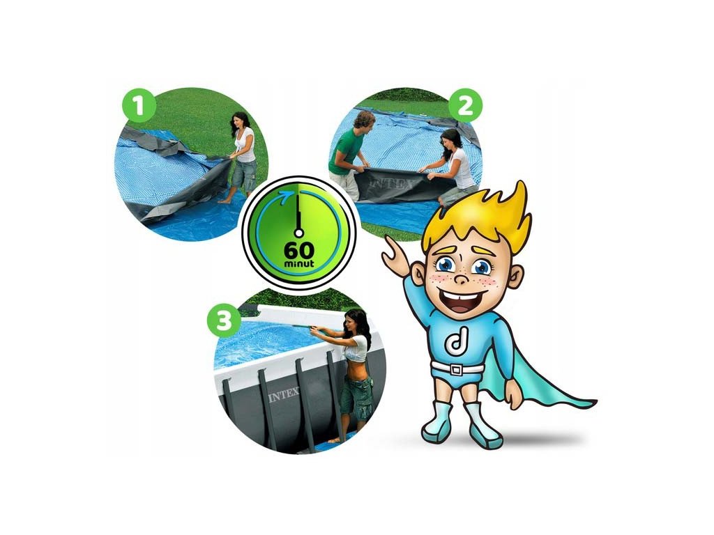 Bazén je ľahký na montáž. Sám si ho pripravíte bez použitia nástrojov za niekoľko chvíľ. Obsah súpravy: