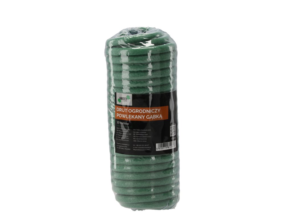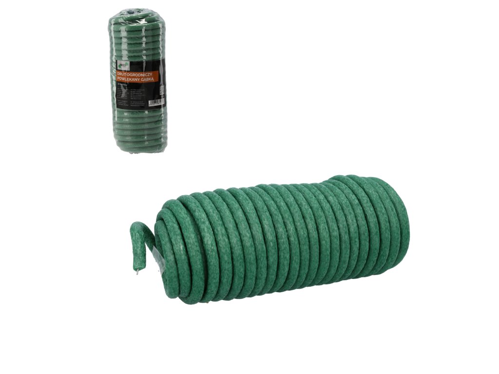Záhradný drôt potiahnutý hubkou sa výborne osvedčuje na priväzovanie rastlín. Môže sa použiť na priväzovanie zeleniny, okrasných rastlín a dokonca aj stromov. Nájde mnohé využitie nielen v záhrade, ale aj v dome. Dokonale podopiera rastliny, chráni ich pred zlomením a uložení na zem. Drôt v mäkkej hubkovej vrstve nezraňuje rastliny a umožňuje im správny rast. Jeho zelená farba spôsobuje, že je prakticky neviditeľný medzi stonkami a listami. Pružný a odolný drôt, ktorý možno slobodne ohýbať a tvarovať, vďaka čomu ním ľahko a rýchlo priviažeme rastliny. Dodatočný obal z mäkkej hubky spôsobuje, že tento drôt možno využiť pre veľmi jemné rastliny, pretože ich nepoškodzuje a nezraňuje. Záhradný drôt potiahnutý hubkou je odolný voči pôsobeniu poveternostných podmienok, preto ho bez problémov môžeme využívať v záhrade.• Drôt potiahnutý hubkou slúži na priväzovanie a spájanie rastlín.
