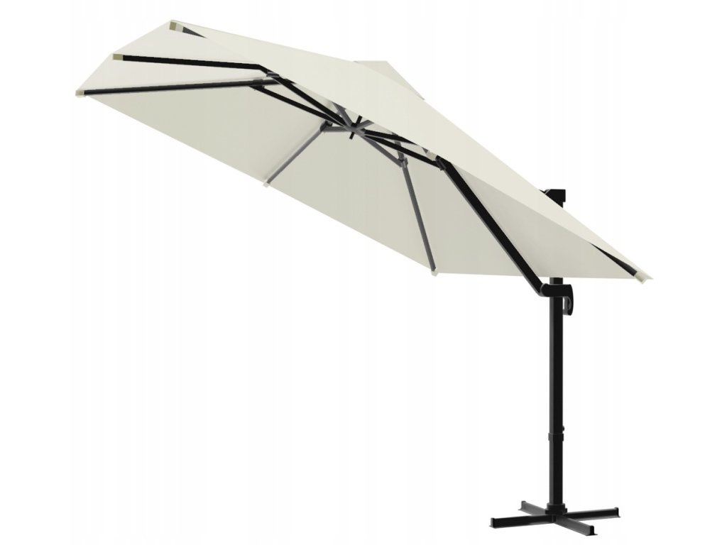 Slnečník je vyrobený z vysoko kvalitného materiálu. Plášť je vyrobený z vodotesného materiálu. Náš produkt je vybavený pevným rámom z ocele práškovo lakovanej. V plášti sa nachádza špeciálny vetrací otvor. Navyše slnečník obsahuje vodotesný kryt z polyesteru čiernej farby.